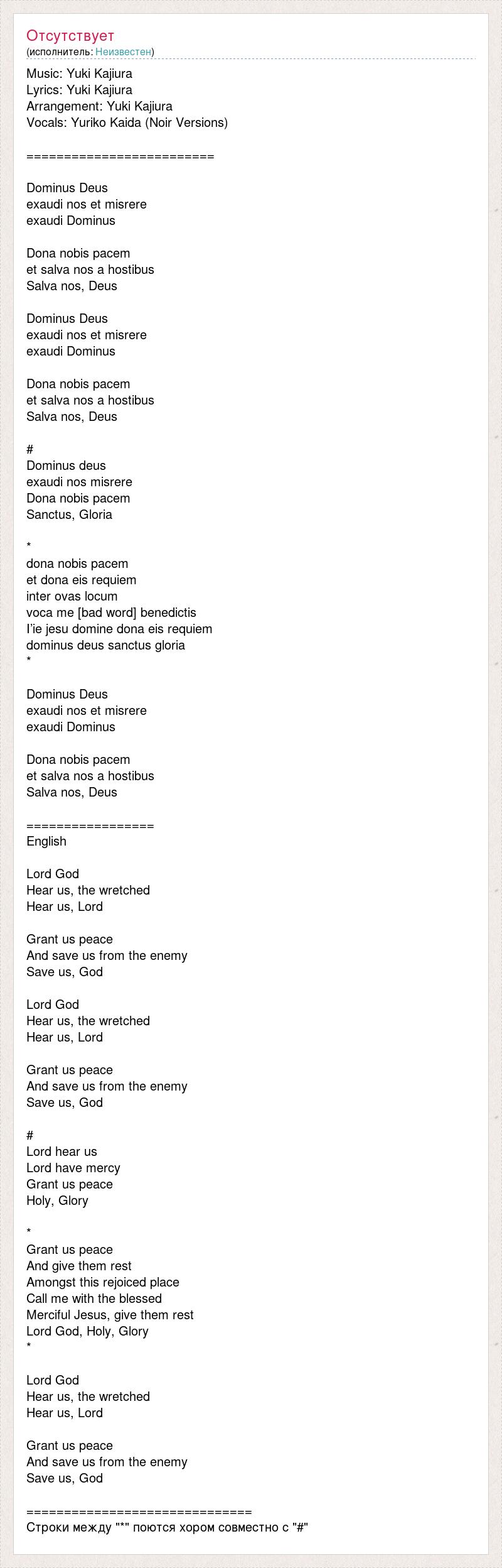 Music: Yuki Kajiura Lyrics: Yuki Kajiura Arrangement: Yuki Kajiura Vocals: Yuriko Kaida (Noir Versions) ========================= Dominus Deus exaudi nos et misrere exaudi Dominus Dona nobis pacem et salva nos a hostibus Salva nos, Deus Dominus Deus exaudi nos et misrere exaudi Dominus Dona nobis pacem et salva nos a hostibus Salva nos, Deus # Dominus deus exaudi nos misrere Dona nobis pacem Sanctus, Gloria * dona nobis pacem et dona eis requiem inter ovas locum voca me [bad word] benedictis I’ie jesu domine dona eis requiem dominus deus sanctus gloria * Dominus Deus exaudi nos et misrere exaudi Dominus Dona nobis pacem et salva nos a hostibus Salva nos, Deus ================= English Lord God Hear us, the wretched Hear us, Lord Grant us peace And save us from the enemy Save us, God Lord God Hear us, the wretched Hear us, Lord Grant us peace And save us from the enemy Save us, God # Lord hear us Lord have mercy Grant us peace Holy, Glory * Grant us peace And give them rest Amongst this rejoiced place Call me with the blessed Merciful Jesus, give them rest Lord God, Holy, Glory * Lord God Hear us, the wretched Hear us, Lord Grant us peace And save us from the enemy Save us, God ============================== Строки между "*" поются хором совместно с "#"