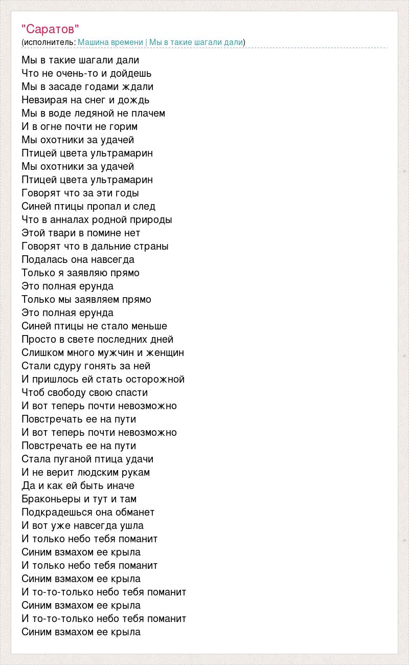 Мы в такие шагали дали Что не очень-то и дойдешь Мы в засаде годами ждали Невзирая на снег и дождь Мы в воде ледяной не плачем И в огне почти не горим Мы охотники за удачей Птицей цвета ультрамарин Мы охотники за удачей Птицей цвета ультрамарин Говорят что за эти годы Синей птицы пропал и след Что в анналах родной природы Этой твари в помине нет Говорят что в дальние страны Подалась она навсегда Только я заявляю прямо Это полная ерунда Только мы заявляем прямо Это полная ерунда Синей птицы не стало меньше Просто в свете последних дней Слишком много мужчин и женщин Стали сдуру гонять за ней И пришлось ей стать осторожной Чтоб свободу свою спасти И вот теперь почти невозможно Повстречать ее на пути И вот теперь почти невозможно Повстречать ее на пути Стала пуганой птица удачи И не верит людским рукам Да и как ей быть иначе Браконьеры и тут и там Подкрадешься она обманет И вот уже навсегда ушла И только небо тебя поманит Синим взмахом ее крыла И только небо тебя поманит Синим взмахом ее крыла И то-то-только небо тебя поманит Синим взмахом ее крыла И то-то-только небо тебя поманит Синим взмахом ее крыла