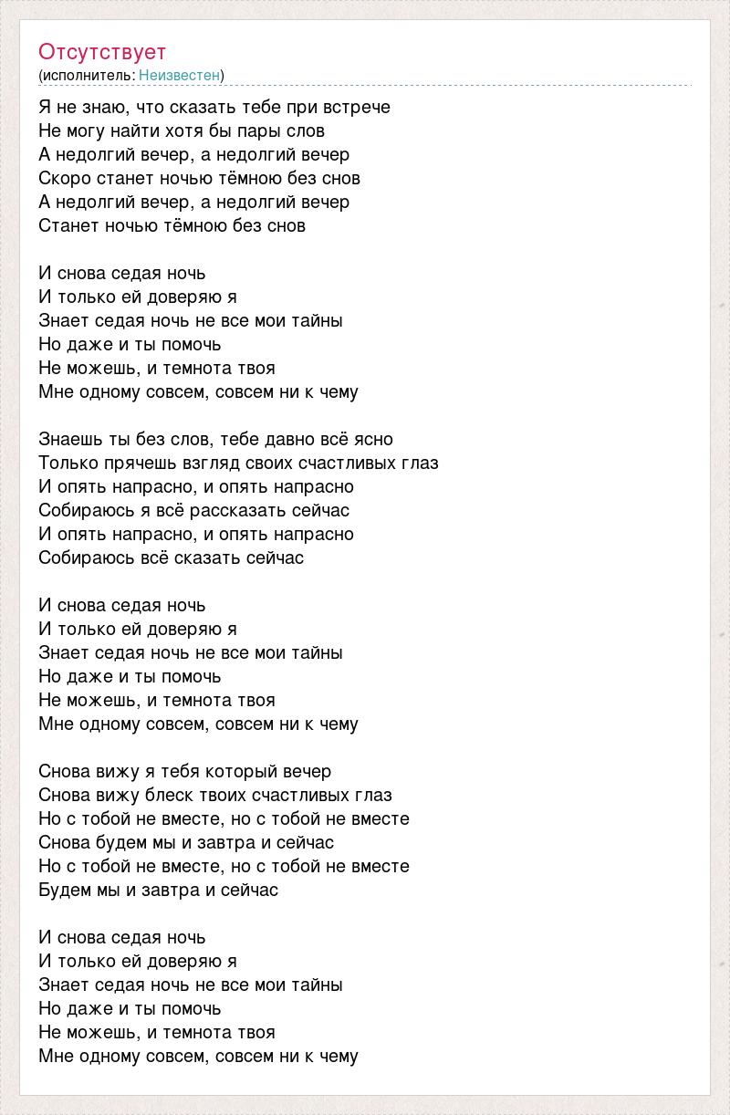 Я не знаю, что сказать тебе при встрече Не могу найти хотя бы пары слов А недолгий вечер, а недолгий вечер Скоро станет ночью тёмною без снов А недолгий вечер, а недолгий вечер Станет ночью тёмною без снов И снова седая ночь И только ей доверяю я Знает седая ночь не все мои тайны Но даже и ты помочь Не можешь, и темнота твоя Мне одному совсем, совсем ни к чему Знаешь ты без слов, тебе давно всё ясно Только прячешь взгляд своих счастливых глаз И опять напрасно, и опять напрасно Собираюсь я всё рассказать сейчас И опять напрасно, и опять напрасно Собираюсь всё сказать сейчас И снова седая ночь И только ей доверяю я Знает седая ночь не все мои тайны Но даже и ты помочь Не можешь, и темнота твоя Мне одному совсем, совсем ни к чему Снова вижу я тебя который вечер Снова вижу блеск твоих счастливых глаз Но с тобой не вместе, но с тобой не вместе Снова будем мы и завтра и сейчас Но с тобой не вместе, но с тобой не вместе Будем мы и завтра и сейчас И снова седая ночь И только ей доверяю я Знает седая ночь не все мои тайны Но даже и ты помочь Не можешь, и темнота твоя Мне одному совсем, совсем ни к чему