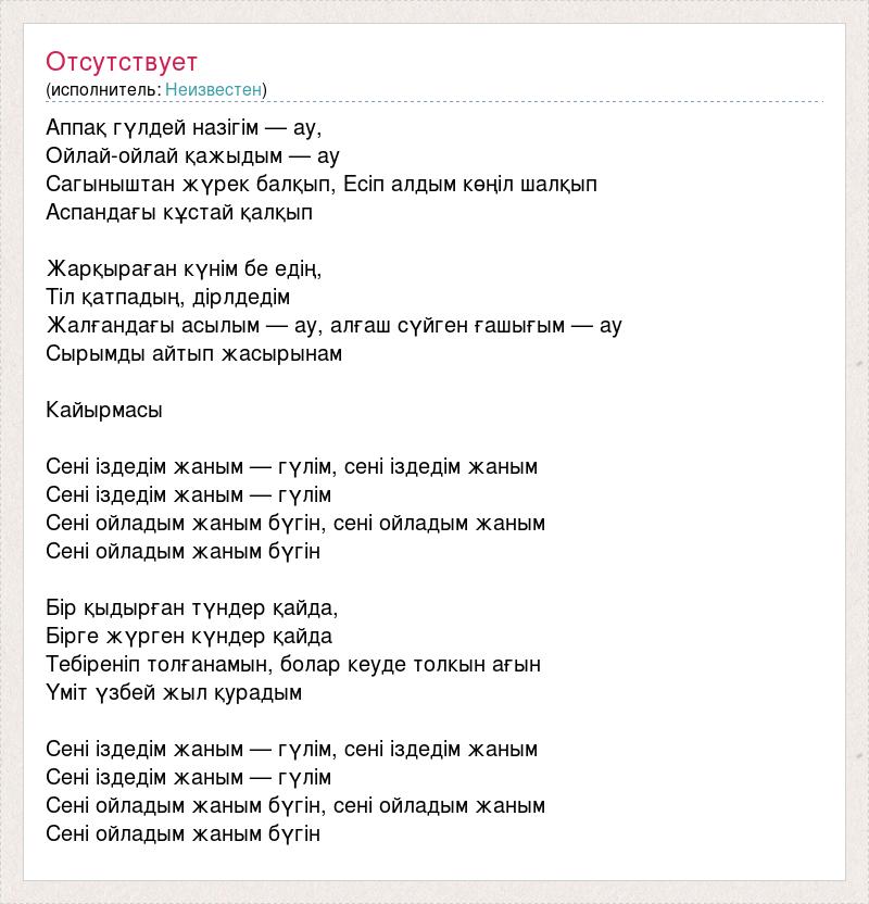 Аппақ гүлдей назігім — ау, Ойлай-ойлай қажыдым — ау Сагыныштан жүрек балқып, Есіп алдым көңіл шалқып Аспандағы кұстай қалқып Жарқыраған күнім бе едің, Tіл қатпадың, дірлдедім Жалғандағы асылым — ау, алғаш сүйген ғашығым — ау Сырымды айтып жасырынам Кайырмасы Сені іздедім жаным — гүлім, сені іздедім жаным Сені іздедім жаным — гүлім Сені ойладым жаным бүгін, сені ойладым жаным Сені ойладым жаным бүгін Бір қыдырған түндер қайда, Бірге жүрген күндер қайда Тебіреніп толғанамын, болар кеуде толкын ағын Үміт үзбей жыл қурадым Сені іздедім жаным — гүлім, сені іздедім жаным Сені іздедім жаным — гүлім Сені ойладым жаным бүгін, сені ойладым жаным Сені ойладым жаным бүгін