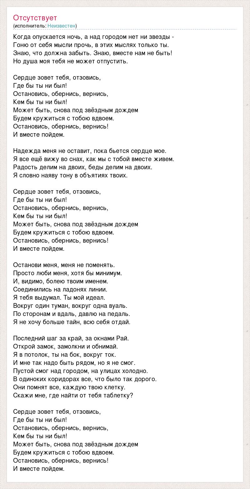 Когда опускается ночь, а над городом нет ни звезды - Гоню от себя мысли прочь, в этих мыслях только ты. Знаю, что должна забыть. Знаю, вместе нам не быть! Но душа моя тебя не может отпустить. Сердце зовет тебя, отзовись, Где бы ты ни был! Остановись, обернись, вернись, Кем бы ты ни был! Может быть, снова под звёздным дождем Будем кружиться с тобою вдвоем. Остановись, обернись, вернись! И вместе пойдем. Надежда меня не оставит, пока бьется сердце мое. Я все ещё вижу во снах, как мы с тобой вместе живем. Радость делим на двоих, беды делим на двоих. Я словно наяву тону в объятиях твоих. Сердце зовет тебя, отзовись, Где бы ты ни был! Остановись, обернись, вернись, Кем бы ты ни был! Может быть, снова под звёздным дождем Будем кружиться с тобою вдвоем. Остановись, обернись, вернись! И вместе пойдем. Останови меня, меня не поменять. Просто люби меня, хотя бы минимум. И, видимо, болею твоим именем. Соединились на ладонях линии. Я тебя выдумал. Ты мой идеал. Вокруг один туман, вокруг одна вуаль. По сторонам и вдаль, давлю на педаль. Я не хочу больше тайн, всю себя отдай. Последний шаг за край, за окнами Рай. Открой замок, замолкни и обнимай. Я в потолок, ты на бок, вокруг ток. И мне так надо быть рядом, но я не смог. Пустой смог над городом, на улицах холодно. В одиноких коридорах все, что было так дорого. Они помнят все, каждую твою клетку. Скажи мне, где найти от тебя таблетку? Сердце зовет тебя, отзовись, Где бы ты ни был! Остановись, обернись, вернись, Кем бы ты ни был! Может быть, снова под звёздным дождем Будем кружиться с тобою вдвоем. Остановись, обернись, вернись! И вместе пойдем.