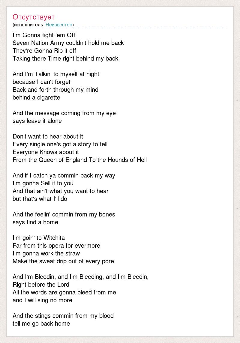 I'm Gonna fight 'em Off Seven Nation Army couldn't hold me back They're Gonna Rip it off Taking there Time right behind my back And I'm Talkin' to myself at night because I can't forget Back and forth through my mind behind a cigarette And the message coming from my eye says leave it alone Don't want to hear about it Every single one's got a story to tell Everyone Knows about it From the Queen of England To the Hounds of Hell And if I catch ya commin back my way I'm gonna Sell it to you And that ain't what you want to hear but that's what I'll do And the feelin' commin from my bones says find a home I'm goin' to Witchita Far from this opera for evermore I'm gonna work the straw Make the sweat drip out of every pore And I'm Bleedin, and I'm Bleeding, and I'm Bleedin, Right before the Lord All the words are gonna bleed from me and I will sing no more And the stings commin from my blood tell me go back home