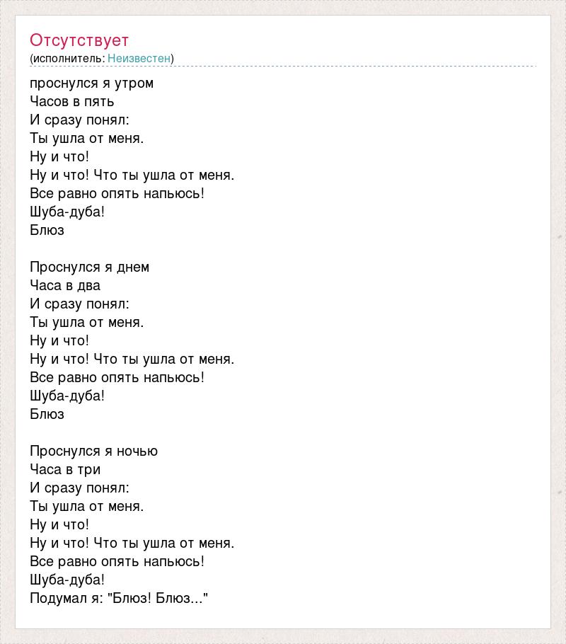 проснулся я утром Часов в пять И сразу понял: Ты ушла от меня. Ну и что! Ну и что! Что ты ушла от меня. Все равно опять напьюсь! Шуба-дуба! Блюз Проснулся я днем Часа в два И сразу понял: Ты ушла от меня. Ну и что! Ну и что! Что ты ушла от меня. Все равно опять напьюсь! Шуба-дуба! Блюз Проснулся я ночью Часа в три И сразу понял: Ты ушла от меня. Ну и что! Ну и что! Что ты ушла от меня. Все равно опять напьюсь! Шуба-дуба! Подумал я: "Блюз! Блюз..."