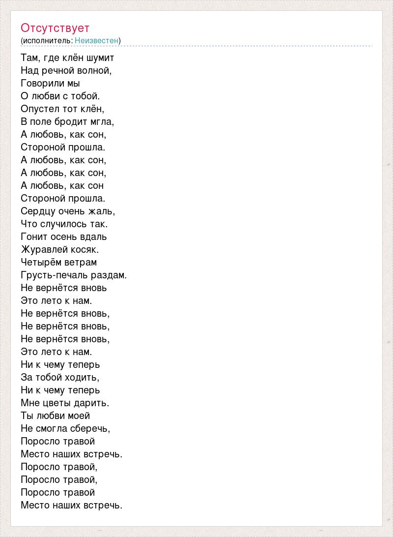 Там, где клён шумит Над речной волной, Говорили мы О любви с тобой. Опустел тот клён, В поле бродит мгла, А любовь, как сон, Стороной прошла. А любовь, как сон, А любовь, как сон, А любовь, как сон Стороной прошла. Сердцу очень жаль, Что случилось так. Гонит осень вдаль Журавлей косяк. Четырём ветрам Грусть-печаль раздам. Не вернётся вновь Это лето к нам. Не вернётся вновь, Не вернётся вновь, Не вернётся вновь, Это лето к нам. Ни к чему теперь За тобой ходить, Ни к чему теперь Мне цветы дарить. Ты любви моей Не смогла сберечь, Поросло травой Место наших встречь. Поросло травой, Поросло травой, Поросло травой Место наших встречь.