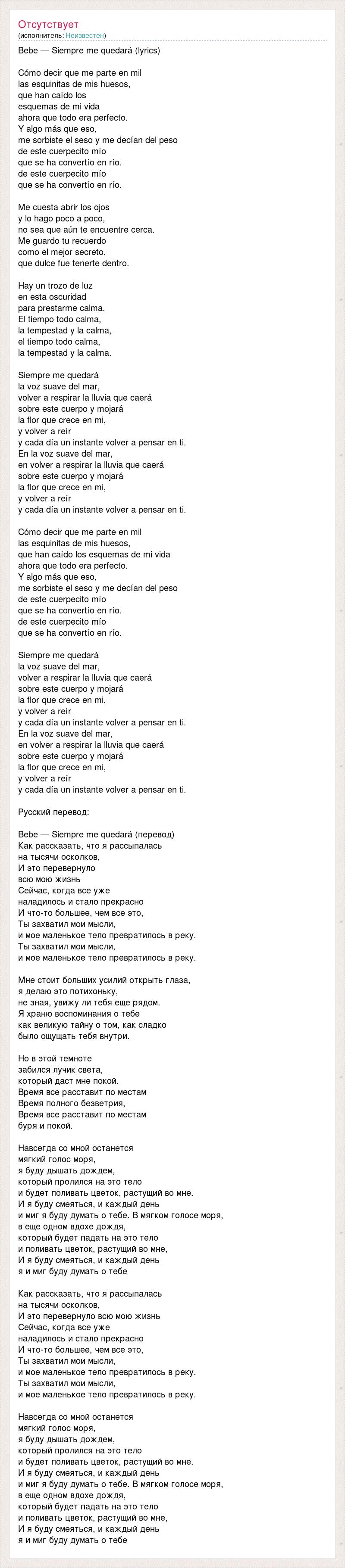 Bebe — Siempre me quedará (lyrics) Cómo decir que me parte en mil las esquinitas de mis huesos, que han caído los esquemas de mi vida ahora que todo era perfecto. Y algo más que eso, me sorbiste el seso y me decían del peso de este cuerpecito mío que se ha convertío en río. de este cuerpecito mío que se ha convertío en río. Me cuesta abrir los ojos y lo hago poco a poco, no sea que aún te encuentre cerca. Me guardo tu recuerdo como el mejor secreto, que dulce fue tenerte dentro. Hay un trozo de luz en esta oscuridad para prestarme calma. El tiempo todo calma, la tempestad y la calma, el tiempo todo calma, la tempestad y la calma. Siempre me quedará la voz suave del mar, volver a respirar la lluvia que caerá sobre este cuerpo y mojará la flor que crece en mi, y volver a reír y cada día un instante volver a pensar en ti. En la voz suave del mar, en volver a respirar la lluvia que caerá sobre este cuerpo y mojará la flor que crece en mi, y volver a reír y cada día un instante volver a pensar en ti. Cómo decir que me parte en mil las esquinitas de mis huesos, que han caído los esquemas de mi vida ahora que todo era perfecto. Y algo más que eso, me sorbiste el seso y me decían del peso de este cuerpecito mío que se ha convertío en río. de este cuerpecito mío que se ha convertío en río. Siempre me quedará la voz suave del mar, volver a respirar la lluvia que caerá sobre este cuerpo y mojará la flor que crece en mi, y volver a reír y cada día un instante volver a pensar en ti. En la voz suave del mar, en volver a respirar la lluvia que caerá sobre este cuerpo y mojará la flor que crece en mi, y volver a reír y cada día un instante volver a pensar en ti. Русский перевод: Bebe — Siempre me quedará (перевод) Как рассказать, что я рассыпалась на тысячи осколков, И это перевернуло всю мою жизнь Сейчас, когда все уже наладилось и стало прекрасно И что-то большее, чем все это, Ты захватил мои мысли, и мое маленькое тело превратилось в реку. Ты захватил мои мысли, и мое маленькое тело превратилось в реку. Мне стоит больших усилий открыть глаза, я делаю это потихоньку, не зная, увижу ли тебя еще рядом. Я храню воспоминания о тебе как великую тайну о том, как сладко было ощущать тебя внутри. Но в этой темноте забился лучик света, который даст мне покой. Время все расставит по местам Время полного безветрия, Время все расставит по местам буря и покой. Навсегда со мной останется мягкий голос моря, я буду дышать дождем, который пролился на это тело и будет поливать цветок, растущий во мне. И я буду смеяться, и каждый день и миг я буду думать о тебе. В мягком голосе моря, в еще одном вдохе дождя, который будет падать на это тело и поливать цветок, растущий во мне, И я буду смеяться, и каждый день я и миг буду думать о тебе Как рассказать, что я рассыпалась на тысячи осколков, И это перевернуло всю мою жизнь Сейчас, когда все уже наладилось и стало прекрасно И что-то большее, чем все это, Ты захватил мои мысли, и мое маленькое тело превратилось в реку. Ты захватил мои мысли, и мое маленькое тело превратилось в реку. Навсегда со мной останется мягкий голос моря, я буду дышать дождем, который пролился на это тело и будет поливать цветок, растущий во мне. И я буду смеяться, и каждый день и миг я буду думать о тебе. В мягком голосе моря, в еще одном вдохе дождя, который будет падать на это тело и поливать цветок, растущий во мне, И я буду смеяться, и каждый день я и миг буду думать о тебе