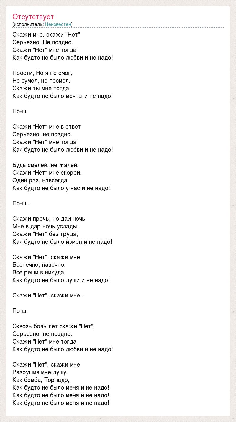 Скажи мне, скажи "Нет" Серьезно, Не поздно. Скажи "Нет" мне тогда Как будто не было любви и не надо! Прости, Но я не смог, Не сумел, не посмел. Скажи ты мне тогда, Как будто не было мечты и не надо! Пр-ш. Скажи "Нет" мне в ответ Серьезно, не поздно. Скажи "Нет" мне тогда Как будто не было любви и не надо! Будь смелей, не жалей, Скажи "Нет" мне скорей. Один раз, навсегда Как будто не было у нас и не надо! Пр-ш.. Скажи прочь, но дай ночь Мне в дар ночь услады. Скажи "Нет" без труда, Как будто не было измен и не надо! Скажи "Нет", скажи мне Беспечно, навечно. Все реши в никуда, Как будто не было души и не надо! Скажи "Нет", скажи мне... Пр-ш. Сквозь боль лет скажи "Нет", Серьезно, не поздно. Скажи "Нет" мне тогда Как будто не было любви и не надо! Скажи "Нет", скажи мне Разрушив мне душу. Как бомба, Торнадо, Как будто не было меня и не надо! Как будто не было меня и не надо! Как будто не было меня и не надо!