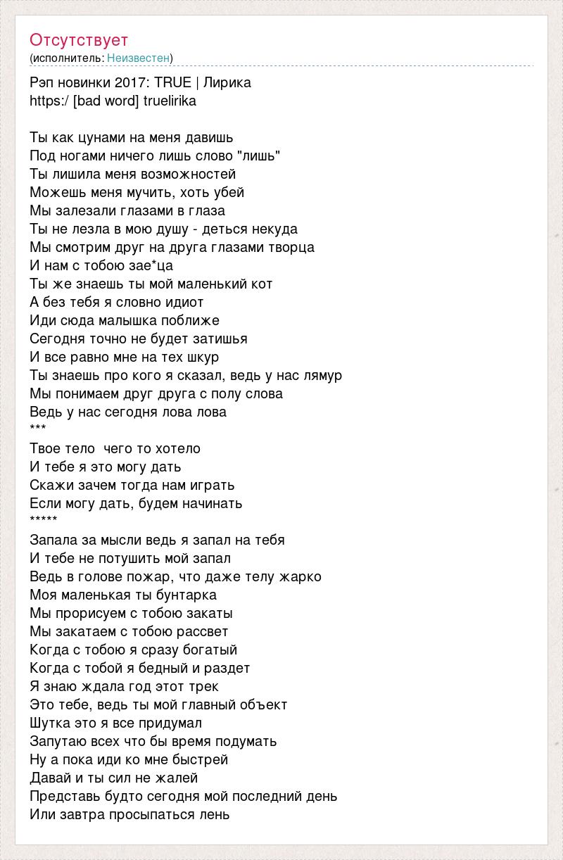 Рэп новинки 2017: TRUE | Лирика https:/ [bad word] truelirika Ты как цунами на меня давишь Под ногами ничего лишь слово "лишь" Ты лишила меня возможностей Можешь меня мучить, хоть убей Мы залезали глазами в глаза Ты не лезла в мою душу - деться некуда Мы смотрим друг на друга глазами творца И нам с тобою зае*ца Ты же знаешь ты мой маленький кот А без тебя я словно идиот Иди сюда малышка поближе Сегодня точно не будет затишья И все равно мне на тех шкур Ты знаешь про кого я сказал, ведь у нас лямур Мы понимаем друг друга с полу слова Ведь у нас сегодня лова лова *** Твое тело чего то хотело И тебе я это могу дать Скажи зачем тогда нам играть Если могу дать, будем начинать ***** Запала за мысли ведь я запал на тебя И тебе не потушить мой запал Ведь в голове пожар, что даже телу жарко Моя маленькая ты бунтарка Мы прорисуем с тобою закаты Мы закатаем с тобою рассвет Когда с тобою я сразу богатый Когда с тобой я бедный и раздет Я знаю ждала год этот трек Это тебе, ведь ты мой главный объект Шутка это я все придумал Запутаю всех что бы время подумать Ну а пока иди ко мне быстрей Давай и ты сил не жалей Представь будто сегодня мой последний день Или завтра просыпаться лень