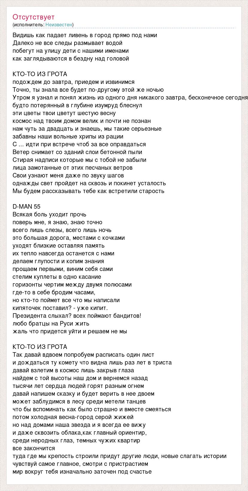 Видишь как падает ливень в город прямо под нами Далеко не все следы размывает водой побегут на улицу дети с нашими именами как заглядываются в бездну над головой КТО-ТО ИЗ ГРОТА подождем до завтра, приедем и извинимся Точно, ты знала все будет по-другому этой же ночью Утром я узнал и понял жизнь из одного дня никакого завтра, бесконечное сегодня будто потерянный в глубине изумруд блеснул эти цветы твои цветут шестую весну космос над твоим домом велик и почти не познан нам чуть за двадцать и знаешь, мы такие серьезные забавны наши вольные хрипы из рации С ... идти при встрече чтоб за все оправдаться Ветер снимает со зданий слои бетонной пыли Стирая надписи которые мы с тобой не забыли лица замотанные от этих песчаных ветров Свои узнают меня даже по звуку шагов однажды свет пройдет на сквозь и покинет усталость Мы будем рассказывать тебе как встретили старость D-MAN 55 Всякая боль уходит прочь поверь мне, я знаю, знаю точно всего лишь слезы, всего лишь ночь это большая дорога, местами с кочками уходят близкие оставляя память их тепло навсегда останется с нами делаем глупости и копим знания прощаем первыми, виним себя сами стелим куплеты в одно касание горизонты чертим между двумя полюсами где-то в себе бродим часами, но кто-то поймет все что мы написали кипяточек поставил? - уже кипит. Президента слыхал? всех поймают бандитов! любо братцы на Руси жить жаль что придется уйти и решаем не мы КТО-ТО ИЗ ГРОТА Так давай вдвоем попробуем расписать один лист и дождаться ту комету что видна лишь раз лет в триста давай взлетим в космос лишь закрыв глаза найдем с той высоты наш дом и вернемся назад тысячи лет сердца людей горят разным огнем давай напишем сказку и будет верить в нее двоем может заблудимся в лесу среди метели танцев что бы вспоминать как было страшно и вместе смеяться потом холодная весна-город серой жижей но над домами наша звезда и я всегда ее вижу и даже сквозить облака,как главный ориентир, среди неродных глаз, темных чужих квартир все закончится туда где мы крепость строили придут другие люди, новые слагать истории чувствуй самое главное, смотри с пристрастием мир вокруг тебя изначально заточен под счастье