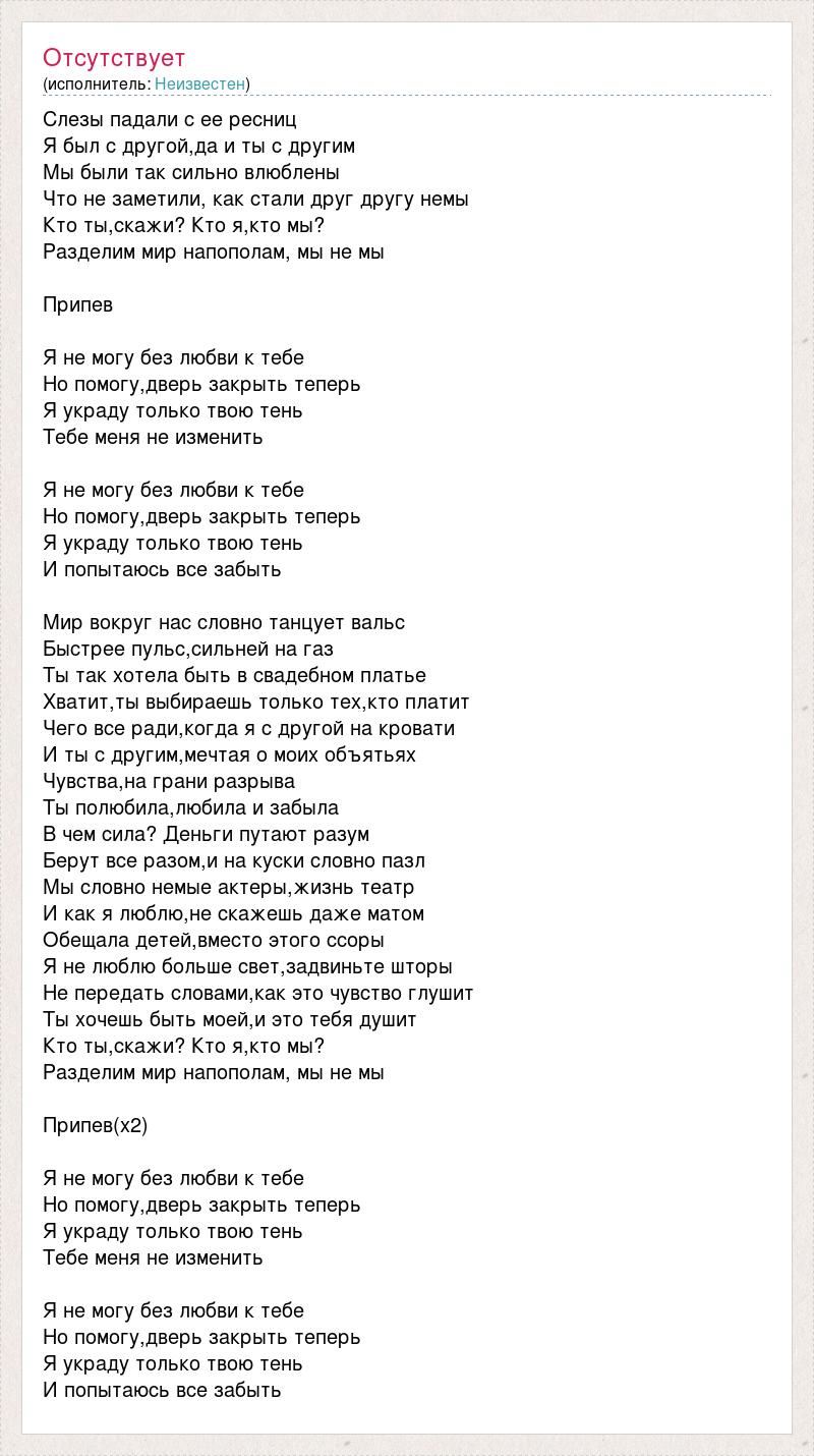 Слезы падали с ее ресниц Я был с другой,да и ты с другим Мы были так сильно влюблены Что не заметили, как стали друг другу немы Кто ты,скажи? Кто я,кто мы? Разделим мир напополам, мы не мы Припев Я не могу без любви к тебе Но помогу,дверь закрыть теперь Я украду только твою тень Тебе меня не изменить Я не могу без любви к тебе Но помогу,дверь закрыть теперь Я украду только твою тень И попытаюсь все забыть Мир вокруг нас словно танцует вальс Быстрее пульс,сильней на газ Ты так хотела быть в свадебном платье Хватит,ты выбираешь только тех,кто платит Чего все ради,когда я с другой на кровати И ты с другим,мечтая о моих объятьях Чувства,на грани разрыва Ты полюбила,любила и забыла В чем сила? Деньги путают разум Берут все разом,и на куски словно пазл Мы словно немые актеры,жизнь театр И как я люблю,не скажешь даже матом Обещала детей,вместо этого ссоры Я не люблю больше свет,задвиньте шторы Не передать словами,как это чувство глушит Ты хочешь быть моей,и это тебя душит Кто ты,скажи? Кто я,кто мы? Разделим мир напополам, мы не мы Припев(х2) Я не могу без любви к тебе Но помогу,дверь закрыть теперь Я украду только твою тень Тебе меня не изменить Я не могу без любви к тебе Но помогу,дверь закрыть теперь Я украду только твою тень И попытаюсь все забыть