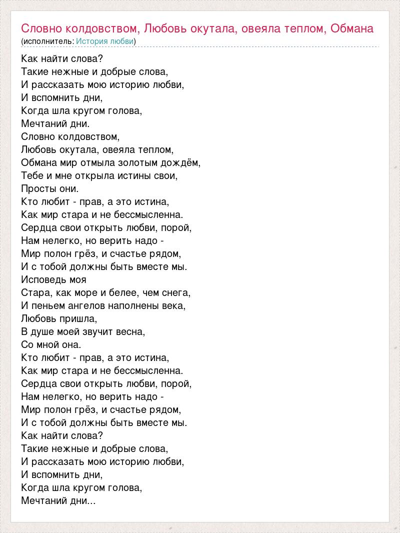 Как найти слова? Такие нежные и добрые слова, И рассказать мою историю любви, И вспомнить дни, Когда шла кругом голова, Мечтаний дни. Словно колдовством, Любовь окутала, овеяла теплом, Обмана мир отмыла золотым дождём, Тебе и мне открыла истины свои, Просты они. Кто любит - прав, а это истина, Как мир стара и не бессмысленна. Сердца свои открыть любви, порой, Нам нелегко, но верить надо - Мир полон грёз, и счастье рядом, И с тобой должны быть вместе мы. Исповедь моя Стара, как море и белее, чем снега, И пеньем ангелов наполнены века, Любовь пришла, В душе моей звучит весна, Со мной она. Кто любит - прав, а это истина, Как мир стара и не бессмысленна. Сердца свои открыть любви, порой, Нам нелегко, но верить надо - Мир полон грёз, и счастье рядом, И с тобой должны быть вместе мы. Как найти слова? Такие нежные и добрые слова, И рассказать мою историю любви, И вспомнить дни, Когда шла кругом голова, Мечтаний дни...