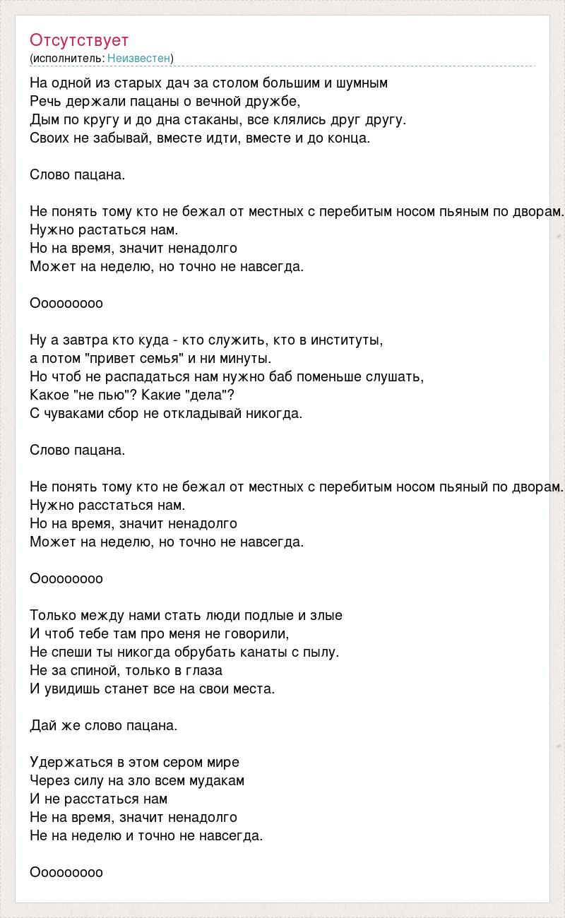 На одной из старых дач за столом большим и шумным Речь держали пацаны о вечной дружбе, Дым по кругу и до дна стаканы, все клялись друг другу. Своих не забывай, вместе идти, вместе и до конца. Слово пацана. Не понять тому кто не бежал от местных с перебитым носом пьяным по дворам. Нужно растаться нам. Но на время, значит ненадолго Может на неделю, но точно не навсегда. Ооооооооо Ну а завтра кто куда - кто служить, кто в институты, а потом "привет семья" и ни минуты. Но чтоб не распадаться нам нужно баб поменьше слушать, Какое "не пью"? Какие "дела"? С чуваками сбор не откладывай никогда. Слово пацана. Не понять тому кто не бежал от местных с перебитым носом пьяный по дворам. Нужно расстаться нам. Но на время, значит ненадолго Может на неделю, но точно не навсегда. Ооооооооо Только между нами стать люди подлые и злые И чтоб тебе там про меня не говорили, Не спеши ты никогда обрубать канаты с пылу. Не за спиной, только в глаза И увидишь станет все на свои места. Дай же слово пацана. Удержаться в этом сером мире Через силу на зло всем мудакам И не расстаться нам Не на время, значит ненадолго Не на неделю и точно не навсегда. Ооооооооо