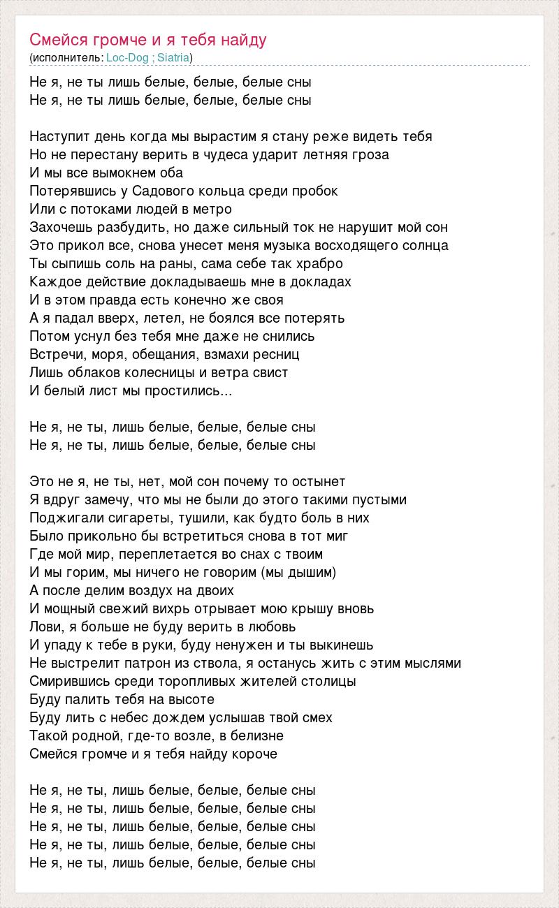Не я, не ты лишь белые, белые, белые сны Не я, не ты лишь белые, белые, белые сны Наступит день когда мы вырастим я стану реже видеть тебя Но не перестану верить в чудеса ударит летняя гроза И мы все вымокнем оба Потерявшись у Садового кольца среди пробок Или с потоками людей в метро Захочешь разбудить, но даже сильный ток не нарушит мой сон Это прикол все, снова унесет меня музыка восходящего солнца Ты сыпишь соль на раны, сама себе так храбро Каждое действие докладываешь мне в докладах И в этом правда есть конечно же своя А я падал вверх, летел, не боялся все потерять Потом уснул без тебя мне даже не снились Встречи, моря, обещания, взмахи ресниц Лишь облаков колесницы и ветра свист И белый лист мы простились... Не я, не ты, лишь белые, белые, белые сны Не я, не ты, лишь белые, белые, белые сны Это не я, не ты, нет, мой сон почему то остынет Я вдруг замечу, что мы не были до этого такими пустыми Поджигали сигареты, тушили, как будто боль в них Было прикольно бы встретиться снова в тот миг Где мой мир, переплетается во снах с твоим И мы горим, мы ничего не говорим (мы дышим) А после делим воздух на двоих И мощный свежий вихрь отрывает мою крышу вновь Лови, я больше не буду верить в любовь И упаду к тебе в руки, буду ненужен и ты выкинешь Не выстрелит патрон из ствола, я останусь жить с этим мыслями Смирившись среди торопливых жителей столицы Буду палить тебя на высоте Буду лить с небес дождем услышав твой смех Такой родной, где-то возле, в белизне Смейся громче и я тебя найду короче Не я, не ты, лишь белые, белые, белые сны Не я, не ты, лишь белые, белые, белые сны Не я, не ты, лишь белые, белые, белые сны Не я, не ты, лишь белые, белые, белые сны Не я, не ты, лишь белые, белые, белые сны
