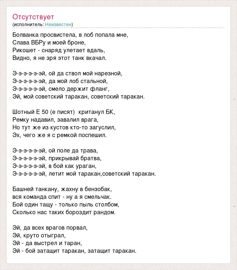 Болванка просвистела, в лоб попала мне, Слава ВБРу и моей броне, Рикошет - снаряд улетает вдаль, Видно, я не зря этот танк вкачал. Э-э-э-э-э-эй, ой да ствол мой нарезной, Э-э-э-э-э-эй, да мой лоб стальной, Э-э-э-э-э-эй, смело держит фланг, Эй, мой советский таракан, советский таракан. Шотный Е 50 (е писят) кританул БК, Ремку надавил, завалил врага, Но тут же из кустов кто-то загуслил, Эх, чего же я с ремкой поспешил. Э-э-э-э-э-эй, ой поле да трава, Э-э-э-э-э-эй, прикрывай братва, Э-э-э-э-э-эй, в бой как ураган, Э-э-э-э-э-эй, летит мой таракан,советский таракан. Башней танкану, жахну в бензобак, вся команда спит - ну а я смельчак. Бой один тащу - только пыль столбом, Сколько нас таких бороздит рандом. Эй, да всех врагов порвал, Эй, круто отыграл, Эй - да выстрел и таран, Эй - бой затащит таракан, затащит таракан.