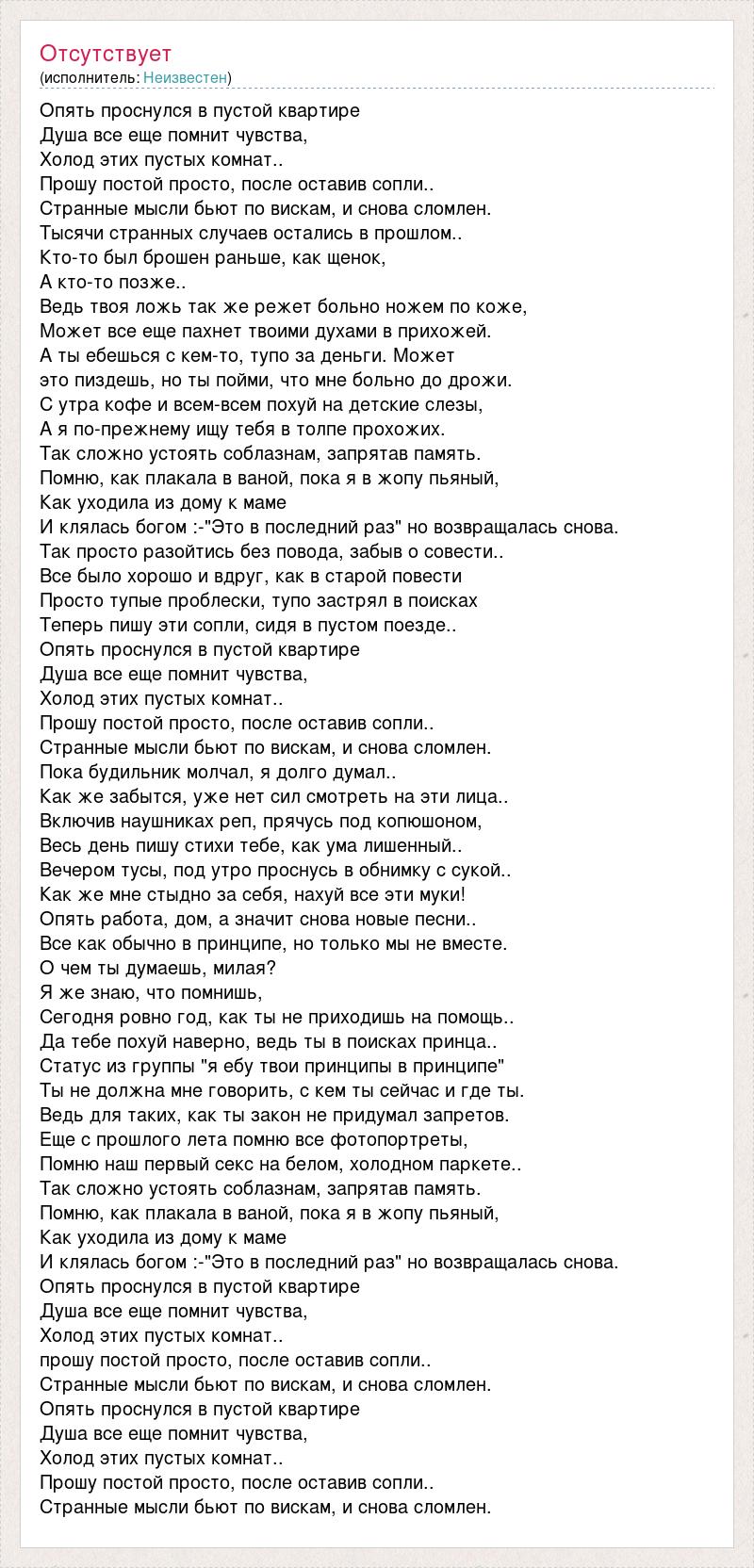 Опять проснулся в пустой квартире Душа все еще помнит чувства, Холод этих пустых комнат.. Прошу постой просто, после оставив сопли.. Странные мысли бьют по вискам, и снова сломлен. Тысячи странных случаев остались в прошлом.. Кто-то был брошен раньше, как щенок, А кто-то позже.. Ведь твоя ложь так же режет больно ножем по коже, Может все еще пахнет твоими духами в прихожей. А ты ебешься с кем-то, тупо за деньги. Может это пиздешь, но ты пойми, что мне больно до дрожи. С утра кофе и всем-всем похуй на детские слезы, А я по-прежнему ищу тебя в толпе прохожих. Так сложно устоять соблазнам, запрятав память. Помню, как плакала в ваной, пока я в жопу пьяный, Как уходила из дому к маме И клялась богом :-"Это в последний раз" но возвращалась снова. Так просто разойтись без повода, забыв о совести.. Все было хорошо и вдруг, как в старой повести Просто тупые проблески, тупо застрял в поисках Теперь пишу эти сопли, сидя в пустом поезде.. Опять проснулся в пустой квартире Душа все еще помнит чувства, Холод этих пустых комнат.. Прошу постой просто, после оставив сопли.. Странные мысли бьют по вискам, и снова сломлен. Пока будильник молчал, я долго думал.. Как же забытся, уже нет сил смотреть на эти лица.. Включив наушниках реп, прячусь под копюшоном, Весь день пишу стихи тебе, как ума лишенный.. Вечером тусы, под утро проснусь в обнимку с сукой.. Как же мне стыдно за себя, нахуй все эти муки! Опять работа, дом, а значит снова новые песни.. Все как обычно в принципе, но только мы не вместе. О чем ты думаешь, милая? Я же знаю, что помнишь, Сегодня ровно год, как ты не приходишь на помощь.. Да тебе похуй наверно, ведь ты в поисках принца.. Статус из группы "я ебу твои принципы в принципе" Ты не должна мне говорить, с кем ты сейчас и где ты. Ведь для таких, как ты закон не придумал запретов. Еще с прошлого лета помню все фотопортреты, Помню наш первый секс на белом, холодном паркете.. Так сложно устоять соблазнам, запрятав память. Помню, как плакала в ваной, пока я в жопу пьяный, Как уходила из дому к маме И клялась богом :-"Это в последний раз" но возвращалась снова. Опять проснулся в пустой квартире Душа все еще помнит чувства, Холод этих пустых комнат.. прошу постой просто, после оставив сопли.. Странные мысли бьют по вискам, и снова сломлен. Опять проснулся в пустой квартире Душа все еще помнит чувства, Холод этих пустых комнат.. Прошу постой просто, после оставив сопли.. Странные мысли бьют по вискам, и снова сломлен.