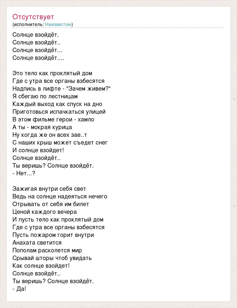 Солнце взойдёт. Солнце взойдёт.. Солнце взойдёт... Солнце взойдёт.... Это тело как проклятый дом Где с утра все органы взбесятся Надпись в лифте - "Зачем живем?" Я сбегаю по лестницам Каждый выход как спуск на дно Приготовься испачкаться улицей В этом фильме герои - хамло А ты - мокрая курица Ну когда же он всех зае..т С наших крыш может съедет снег И солнце взойдет! Солнце взойдёт.. Ты веришь? Солнце взойдёт. - Нет...? Зажигая внутри себя свет Ведь на солнце надеяться нечего Отрывать от себя им билет Ценой каждого вечера И пусть тело как проклятый дом Где с утра все органы взбесятся Пусть пожаром горит внутри Анахата светится Пополам расколется мир Срывай шторы чтоб увидать Как солнце взойдет! Солнце взойдёт.. Ты веришь? Солнце взойдёт. - Да!