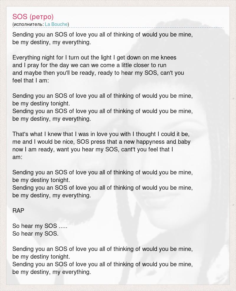 Sending you an SOS of love you all of thinking of would you be mine, be my destiny, my everything. Everything night for I turn out the light I get down on me knees and I pray for the day we can we come a little closer to run and maybe then you'll be ready, ready to hear my SOS, can't you feel that I am: Sending you an SOS of love you all of thinking of would you be mine, be my destiny tonight. Sending you an SOS of love you all of thinking of would you be mine, be my destiny, my everything. That's what I knew that I was in love you with I thought I could it be, me and I would be nice, SOS press that a new happyness and baby now I am ready, want you hear my SOS, cant't you feel that I am: Sending you an SOS of love you all of thinking of would you be mine, be my destiny tonight. Sending you an SOS of love you all of thinking of would you be mine, be my destiny, my everything. RAP So hear my SOS ..... So hear my SOS. Sending you an SOS of love you all of thinking of would you be mine, be my destiny tonight. Sending you an SOS of love you all of thinking of would you be mine, be my destiny, my everything.
