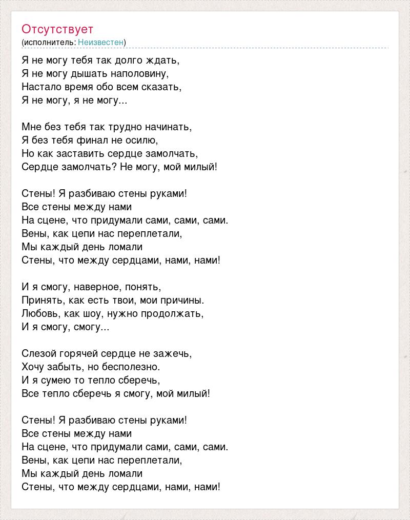 Я не могу тебя так долго ждать, Я не могу дышать наполовину, Настало время обо всем сказать, Я не могу, я не могу... Мне без тебя так трудно начинать, Я без тебя финал не осилю, Но как заставить сердце замолчать, Сердце замолчать? Не могу, мой милый! Стены! Я разбиваю стены руками! Все стены между нами На сцене, что придумали сами, сами, сами. Вены, как цепи нас переплетали, Мы каждый день ломали Стены, что между сердцами, нами, нами! И я смогу, наверное, понять, Принять, как есть твои, мои причины. Любовь, как шоу, нужно продолжать, И я смогу, смогу... Слезой горячей сердце не зажечь, Хочу забыть, но бесполезно. И я сумею то тепло сберечь, Все тепло сберечь я смогу, мой милый! Стены! Я разбиваю стены руками! Все стены между нами На сцене, что придумали сами, сами, сами. Вены, как цепи нас переплетали, Мы каждый день ломали Стены, что между сердцами, нами, нами!