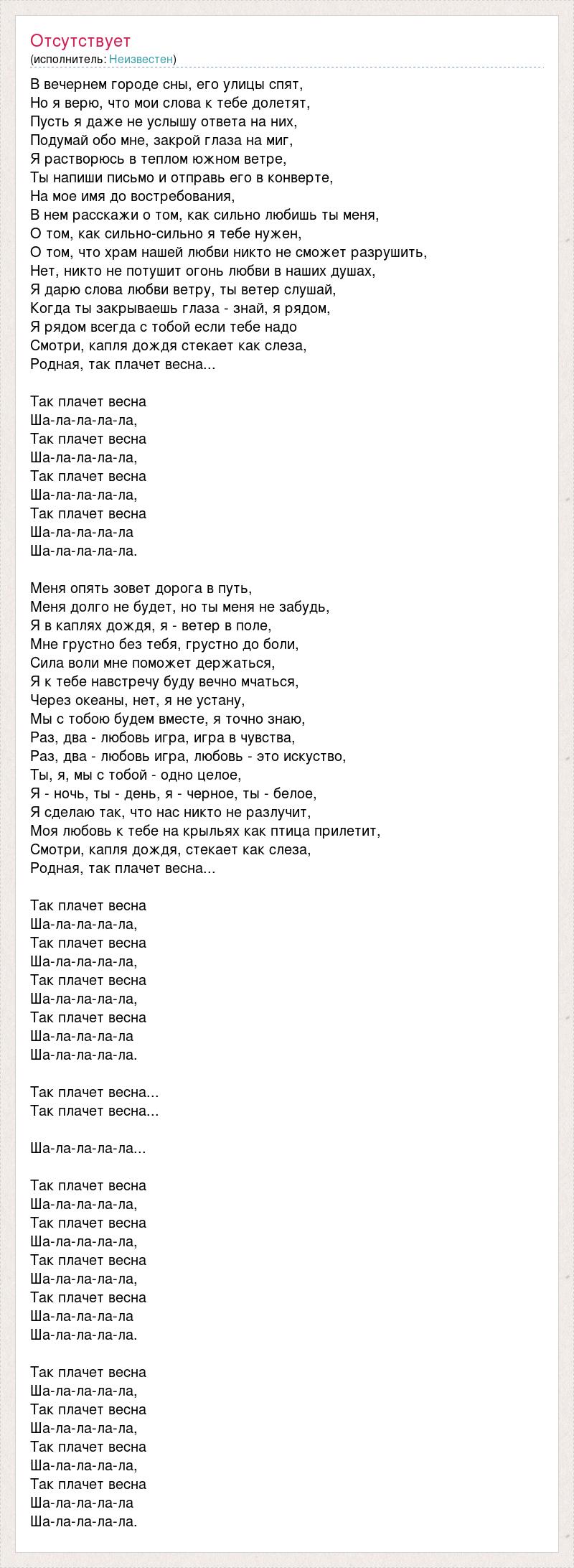 В вечернем городе сны, его улицы спят, Но я верю, что мои слова к тебе долетят, Пусть я даже не услышу ответа на них, Подумай обо мне, закрой глаза на миг, Я растворюсь в теплом южном ветре, Ты напиши письмо и отправь его в конверте, На мое имя до востребования, В нем расскажи о том, как сильно любишь ты меня, О том, как сильно-сильно я тебе нужен, О том, что храм нашей любви никто не сможет разрушить, Нет, никто не потушит огонь любви в наших душах, Я дарю слова любви ветру, ты ветер слушай, Когда ты закрываешь глаза - знай, я рядом, Я рядом всегда с тобой если тебе надо Смотри, капля дождя стекает как слеза, Родная, так плачет весна... Так плачет весна Ша-ла-ла-ла-ла, Так плачет весна Ша-ла-ла-ла-ла, Так плачет весна Ша-ла-ла-ла-ла, Так плачет весна Ша-ла-ла-ла-ла Ша-ла-ла-ла-ла. Меня опять зовет дорога в путь, Меня долго не будет, но ты меня не забудь, Я в каплях дождя, я - ветер в поле, Мне грустно без тебя, грустно до боли, Сила воли мне поможет держаться, Я к тебе навстречу буду вечно мчаться, Через океаны, нет, я не устану, Мы с тобою будем вместе, я точно знаю, Раз, два - любовь игра, игра в чувства, Раз, два - любовь игра, любовь - это искуство, Ты, я, мы с тобой - одно целое, Я - ночь, ты - день, я - черное, ты - белое, Я сделаю так, что нас никто не разлучит, Моя любовь к тебе на крыльях как птица прилетит, Смотри, капля дождя, стекает как слеза, Родная, так плачет весна... Так плачет весна Ша-ла-ла-ла-ла, Так плачет весна Ша-ла-ла-ла-ла, Так плачет весна Ша-ла-ла-ла-ла, Так плачет весна Ша-ла-ла-ла-ла Ша-ла-ла-ла-ла. Так плачет весна... Так плачет весна... Ша-ла-ла-ла-ла... Так плачет весна Ша-ла-ла-ла-ла, Так плачет весна Ша-ла-ла-ла-ла, Так плачет весна Ша-ла-ла-ла-ла, Так плачет весна Ша-ла-ла-ла-ла Ша-ла-ла-ла-ла. Так плачет весна Ша-ла-ла-ла-ла, Так плачет весна Ша-ла-ла-ла-ла, Так плачет весна Ша-ла-ла-ла-ла, Так плачет весна Ша-ла-ла-ла-ла Ша-ла-ла-ла-ла.
