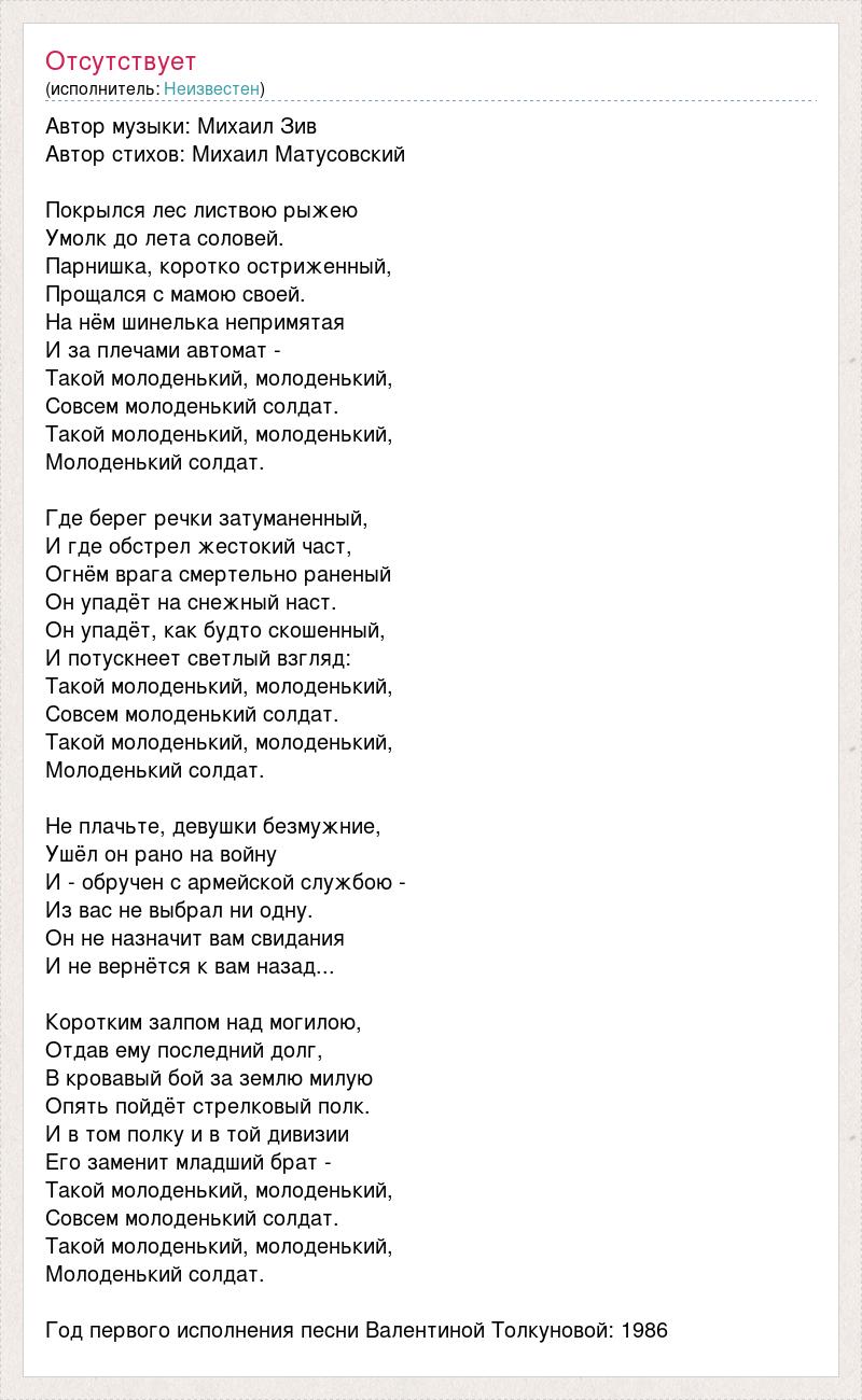 Автор музыки: Михаил Зив Автор стихов: Михаил Матусовский Покрылся лес листвою рыжею Умолк до лета соловей. Парнишка, коротко остриженный, Прощался с мамою своей. На нём шинелька непримятая И за плечами автомат - Такой молоденький, молоденький, Совсем молоденький солдат. Такой молоденький, молоденький, Молоденький солдат. Где берег речки затуманенный, И где обстрел жестокий част, Огнём врага смертельно раненый Он упадёт на снежный наст. Он упадёт, как будто скошенный, И потускнеет светлый взгляд: Такой молоденький, молоденький, Совсем молоденький солдат. Такой молоденький, молоденький, Молоденький солдат. Не плачьте, девушки безмужние, Ушёл он рано на войну И - обручен с армейской службою - Из вас не выбрал ни одну. Он не назначит вам свидания И не вернётся к вам назад... Коротким залпом над могилою, Отдав ему последний долг, В кровавый бой за землю милую Опять пойдёт стрелковый полк. И в том полку и в той дивизии Его заменит младший брат - Такой молоденький, молоденький, Совсем молоденький солдат. Такой молоденький, молоденький, Молоденький солдат. Год первого исполнения песни Валентиной Толкуновой: 1986