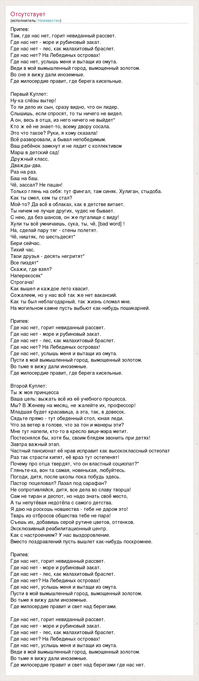 Припев: Там, где нас нет, горит невиданный рассвет. Где нас нет - море и рубиновый закат. Где нас нет - лес, как малахитовый браслет. Где нас нет? На Лебединых островах! Где нас нет, услышь меня и вытащи из омута. Веди в мой вымышленный город, вымощенный золотом. Во сне я вижу дали иноземные. Где милосердие правит, где берега кисельные. Первый Куплет: Ну-ка слёзы вытер! То ли дело их сын, сразу видно, что он лидер. Слышишь, если спросят, то ты ничего не видел. А он, весь в отца, из него ничего не выйдет" Кто ж её не знает-то, всему двору сосала. Это что такое? Руки, я кому сказала! Всё разворовали, а бывал непобедимым. Ваш ребёнок замкнут и не ладит с коллективом Марш в детский сад! Дружный класс. Дважды-два. Раз на раз. Баш на баш. Чё, зассал? Не пацан! Только глянь на себя: тут фингал, там синяк. Хулиган, стыдоба. Как ты смел, кем ты стал? Мой-то? Да всё в облаках, как в детстве витает. Ты ничем не лучше других, чудес не бывает. С нею, да без шансов, он же пугалище с виду! Хули ты всё умничаешь, сука, ты, чё, [bad word] ! На, сделай пару тяг - стены полетят. Чё, ништяк, по шестьдесят" Бери сейчас. Тихий час. Твои друзья - десять негритят" Все пиздят" Скажи, где взял? Наперекосяк" Строгача! Как вышел и каждое лето квасит. Сожалеем, но у нас всё так же нет вакансий. Как ты был неблагодарный, так жизнь сломал мне. На могильном камне пусть выбьют как-нибудь пошикарней. Припев: Где нас нет, горит невиданный рассвет. Где нас нет - море и рубиновый закат. Где нас нет - лес, как малахитовый браслет. Где нас нет? На Лебединых островах! Где нас нет, услышь меня и вытащи из омута. Пусти в мой вымышленный город, вымощенный золотом. Во тьме я вижу дали иноземные. Где милосердие правит, где берега кисельные. Второй Куплет: Ты ж моя принцесса Ваша цель: выжать всё из её учебного процесса. Мы? В Женеву на месяц, не жалейте их, профессор! Младшая будет красавица, а эта, так, в довесок. Сядьте прямо - тут обеденный стол, юная леди. Что за ветер в голове, что за тон и манеры эти? Мне тут напели, кто-то в кресло вице-мэра метит. Постеснялся бы, хотя бы, своим блядям звонить при детях! Завтра важный этап. Частный пансионат её нрав исправит как высококлассный остеопат Раз так страсти кипят, её враз тут остепенят! Почему про отца твердят, что он властный социопат?" Гляньте-ка, вон та самая, новенькая, любуйтесь. Погоди, дитя, после школы пока побудь здесь. Пастор поцеловал? Лазал под сарафан? Не сопротивляйся, дитя, все дела во славу творца! Сам не тиран и деспот, но надо знать своё место, А ты непутёвая недотёпа с самого детства. Я даю на роскошь новшества - тебе не даром это! Тварь из отбросов общества тебе не пара! Съешь их, добавишь серой рутине цветов, оттенков. Эксклюзивный реабилитационный центр. Как с настроением? У нас выздоровление. Вместо поздравлений пусть вышлет как-нибудь поскромнее. Припев: Где нас нет, горит невиданный рассвет. Где нас нет - море и рубиновый закат. Где нас нет - лес, как малахитовый браслет. Где нас нет? На Лебединых островах! Где нас нет, услышь меня и вытащи из омута. Пусти в мой вымышленный город, вымощенный золотом. Во тьме я вижу дали иноземные. Где милосердие правит и свет над берегами. Где нас нет, горит невиданный рассвет. Где нас нет - море и рубиновый закат. Где нас нет - лес, как малахитовый браслет. Где нас нет? На Лебединых островах! Где нас нет, услышь меня и вытащи из омута. Веди в мой вымышленный го