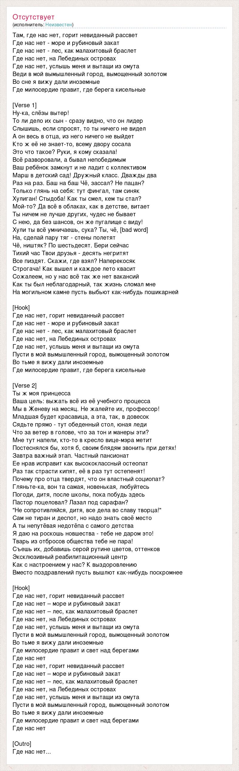 Там, где нас нет, горит невиданный рассвет Где нас нет - море и рубиновый закат Где нас нет - лес, как малахитовый браслет Где нас нет, на Лебединых островах Где нас нет, услышь меня и вытащи из омута Веди в мой вымышленный город, вымощенный золотом Во сне я вижу дали иноземные Где милосердие правит, где берега кисельные [Verse 1] Ну-ка, слёзы вытер! То ли дело их сын - сразу видно, что он лидер Слышишь, если спросят, то ты ничего не видел А он весь в отца, из него ничего не выйдет Кто ж её не знает-то, всему двору сосала Это что такое? Руки, я кому сказала! Всё разворовали, а бывал непобедимым Ваш ребёнок замкнут и не ладит с коллективом Марш в детский сад! Дружный класс. Дважды два Раз на раз. Баш на баш Чё, зассал? Не пацан? Только глянь на себя: тут фингал, там синяк Хулиган! Стыдоба! Как ты смел, кем ты стал? Мой-то? Да всё в облаках, как в детстве, витает Ты ничем не лучше других, чудес не бывает С нею, да без шансов, он же пугалище с виду! Хули ты всё умничаешь, сука? Ты, чё, [bad word] На, сделай пару тяг - стены полетят Чё, ништяк? По шестьдесят. Бери сейчас Тихий час Твои друзья - десять негритят Все пиздят. Скажи, где взял? Наперекосяк Строгача! Как вышел и каждое лето квасит Сожалеем, но у нас всё так же нет вакансий Как ты был неблагодарный, так жизнь сломал мне На могильном камне пусть выбьют как-нибудь пошикарней [Hook] Где нас нет, горит невиданный рассвет Где нас нет - море и рубиновый закат Где нас нет - лес, как малахитовый браслет Где нас нет, на Лебединых островах Где нас нет, услышь меня и вытащи из омута Пусти в мой вымышленный город, вымощенный золотом Во тьме я вижу дали иноземные Где милосердие правит, где берега кисельные [Verse 2] Ты ж моя принцесса Ваша цель: выжать всё из её учебного процесса Мы в Женеву на месяц. Не жалейте их, профессор! Младшая будет красавица, а эта, так, в довесок Сядьте прямо - тут обеденный стол, юная леди Что за ветер в голове, что за тон и манеры эти? Мне тут напели, кто-то в кресло вице-мэра метит Постеснялся бы, хотя б, своим блядям звонить при детях! Завтра важный этап. Частный пансионат Ее нрав исправит как высококлассный остеопат Раз так страсти кипят, её в раз тут остепенят! Почему про отца твердят, что он властный социопат? Гляньте-ка, вон та самая, новенькая, любуйтесь Погоди, дитя, после школы, пока побудь здесь Пастор поцеловал? Лазал под сарафан? "Не сопротивляйся, дитя, все дела во славу творца!" Сам не тиран и деспот, но надо знать своё место А ты непутёвая недотёпа с самого детства Я даю на роскошь новшества - тебе не даром это! Тварь из отбросов общества тебе не пара! Съешь их, добавишь серой рутине цветов, оттенков Эксклюзивный реабилитационный центр Как с настроением у нас? К выздоровлению Вместо поздравлений пусть вышлют как-нибудь поскромнее [Hook] Где нас нет, горит невиданный рассвет Где нас нет – море и рубиновый закат Где нас нет – лес, как малахитовый браслет Где нас нет, на Лебединых островах Где нас нет, услышь меня и вытащи из омута Пусти в мой вымышленный город, вымощенный золотом Во тьме я вижу дали иноземные Где милосердие правит и свет над берегами Где нас нет Где нас нет, горит невиданный рассвет Где нас нет – море и рубиновый закат Где нас нет – лес, как малахитовый браслет Где нас нет, на Лебединых островах Где нас нет, услышь меня и вытащи из омута Пусти в мой вымышленный город, вымощенный золотом Во тьме я вижу дали инозе