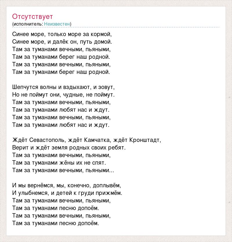 Синее море, только море за кормой, Синее море, и далёк он, путь домой. Там за туманами вечными, пьяными, Там за туманами берег наш родной. Там за туманами вечными, пьяными, Там за туманами берег наш родной. Шепчутся волны и вздыхают, и зовут, Но не поймут они, чудные, не поймут. Там за туманами вечными, пьяными, Там за туманами любят нас и ждут. Там за туманами вечными, пьяными, Там за туманами любят нас и ждут. Ждёт Севастополь, ждёт Камчатка, ждёт Кронштадт, Верит и ждёт земля родных своих ребят. Там за туманами вечными, пьяными, Там за туманами жёны их не спят. Там за туманами вечными, пьяными... И мы вернёмся, мы, конечно, доплывём, И улыбнемся, и детей к груди прижмём. Там за туманами вечными, пьяными, Там за туманами песню допоём. Там за туманами вечными, пьяными, Там за туманами песню допоём.