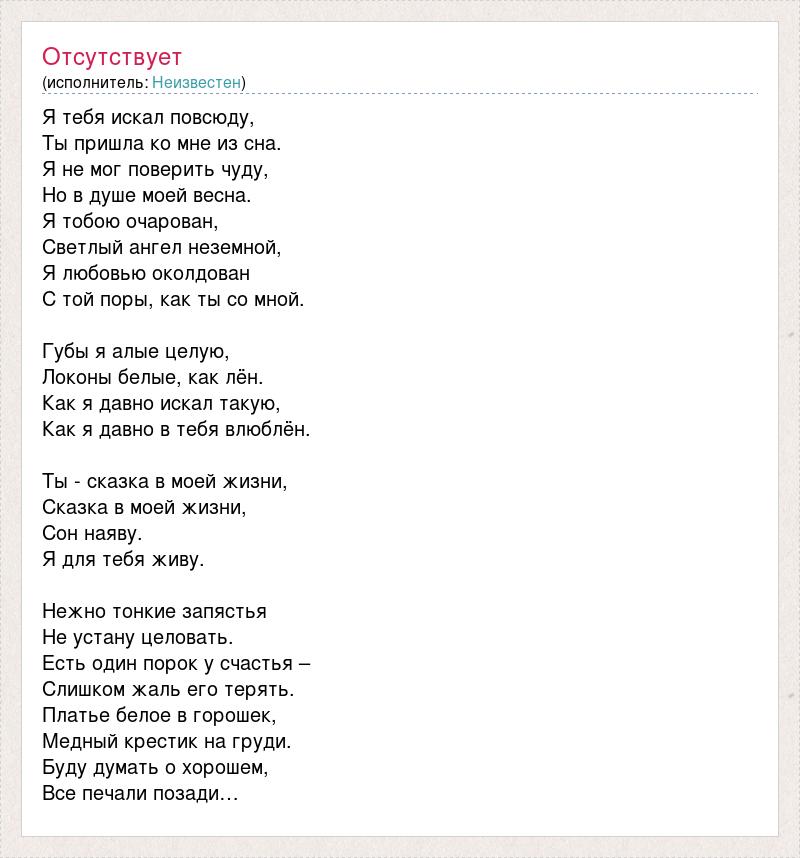 Я тебя искал повсюду, Ты пришла ко мне из сна. Я не мог поверить чуду, Но в душе моей весна. Я тобою очарован, Светлый ангел неземной, Я любовью околдован С той поры, как ты со мной. Губы я алые целую, Локоны белые, как лён. Как я давно искал такую, Как я давно в тебя влюблён. Ты - сказка в моей жизни, Сказка в моей жизни, Сон наяву. Я для тебя живу. Нежно тонкие запястья Не устану целовать. Есть один порок у счастья – Слишком жаль его терять. Платье белое в горошек, Медный крестик на груди. Буду думать о хорошем, Все печали позади…