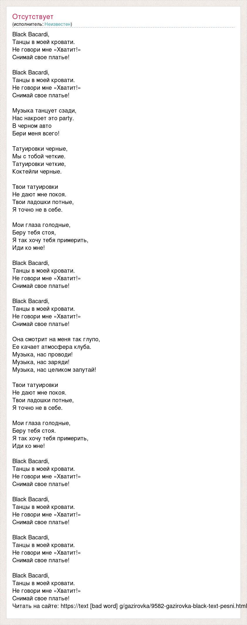 Black Bacardi, Танцы в моей кровати. Не говори мне «Хватит!» Снимай свое платье! Black Bacardi, Танцы в моей кровати. Не говори мне «Хватит!» Снимай свое платье! Музыка танцует сзади, Нас накроет это party. В черном авто Бери меня всего! Татуировки черные, Мы с тобой четкие. Татуировки четкие, Коктейли черные. Твои татуировки Не дают мне покоя. Твои ладошки потные, Я точно не в себе. Мои глаза голодные, Беру тебя стоя, Я так хочу тебя примерить, Иди ко мне! Black Bacardi, Танцы в моей кровати. Не говори мне «Хватит!» Снимай свое платье! Black Bacardi, Танцы в моей кровати. Не говори мне «Хватит!» Снимай свое платье! Она смотрит на меня так глупо, Ее качает атмосфера клуба. Музыка, нас проводи! Музыка, нас заряди! Музыка, нас целиком запутай! Твои татуировки Не дают мне покоя. Твои ладошки потные, Я точно не в себе. Мои глаза голодные, Беру тебя стоя. Я так хочу тебя примерить, Иди ко мне! Black Bacardi, Танцы в моей кровати. Не говори мне «Хватит!» Снимай свое платье! Black Bacardi, Танцы в моей кровати. Не говори мне «Хватит!» Снимай свое платье! Black Bacardi, Танцы в моей кровати. Не говори мне «Хватит!» Снимай свое платье! Black Bacardi, Танцы в моей кровати. Не говори мне «Хватит!» Снимай свое платье! Читать на сайте: https://text [bad word] g/gazirovka/9582-gazirovka-black-text-pesni.html