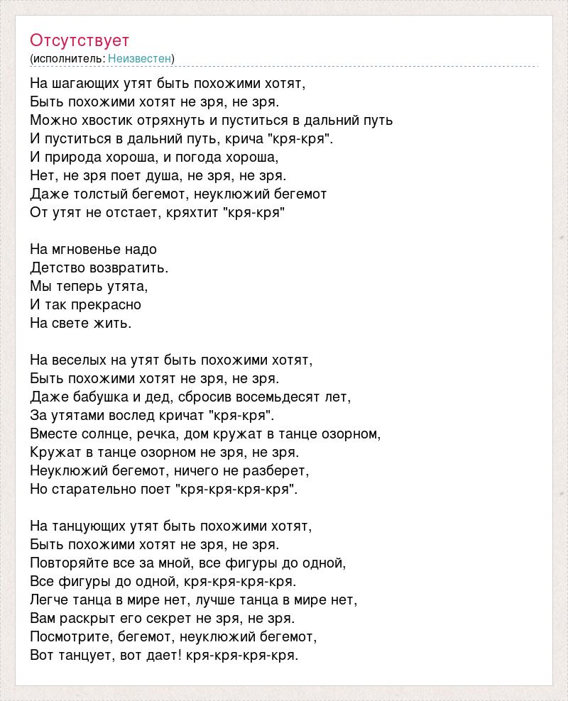 На шагающих утят быть похожими хотят, Быть похожими хотят не зря, не зря. Можно хвостик отряхнуть и пуститься в дальний путь И пуститься в дальний путь, крича "кря-кря". И природа хороша, и погода хороша, Нет, не зря поет душа, не зря, не зря. Даже толстый бегемот, неуклюжий бегемот От утят не отстает, кряхтит "кря-кря" На мгновенье надо Детство возвратить. Мы теперь утята, И так прекрасно На свете жить. На веселых на утят быть похожими хотят, Быть похожими хотят не зря, не зря. Даже бабушка и дед, сбросив восемьдесят лет, За утятами вослед кричат "кря-кря". Вместе солнце, речка, дом кружат в танце озорном, Кружат в танце озорном не зря, не зря. Неуклюжий бегемот, ничего не разберет, Но старательно поет "кря-кря-кря-кря". На танцующих утят быть похожими хотят, Быть похожими хотят не зря, не зря. Повторяйте все за мной, все фигуры до одной, Все фигуры до одной, кря-кря-кря-кря. Легче танца в мире нет, лучше танца в мире нет, Вам раскрыт его секрет не зря, не зря. Посмотрите, бегемот, неуклюжий бегемот, Вот танцует, вот дает! кря-кря-кря-кря.