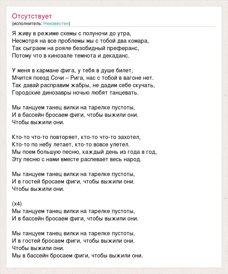 Я живу в режиме схемы с полуночи до утра, Несмотря на все проблемы мы с тобой два комара, Так сыграем на рояле безобидный преферанс, Потому что в кинозале темнота и декаданс. У меня в кармане фига, у тебя в душе билет, Мчится поезд Сочи – Рига, нас с тобой в вагоне нет. Так давай расправим жабры, не дадим себе скучать, Городские динозавры ночью любят танцевать. Мы танцуем танец вилки на тарелке пустоты, И в бассейн бросаем фиги, чтобы выжили они. Чтобы выжили они. Кто-то что-то повторяет, кто-то что-то захотел, Кто-то по небу летает, кто-то вовсе улетел. Мы поем большую песню, каждый день из года в год, Эту песню с нами вместе распевает весь народ. Мы танцуем танец вилки на тарелке пустоты, И в гостей бросаем фиги, чтобы выжили они. Чтобы выжили они. (х4) Мы танцуем танец вилки на тарелке пустоты, И в бассейн бросаем фиги, чтобы выжили они. Мы танцуем танец вилки на тарелке пустоты, И в гостей бросаем фиги, чтобы выжили они. Чтобы выжили они. Мы в бассейн бросаем фиги, чтобы выжили они.