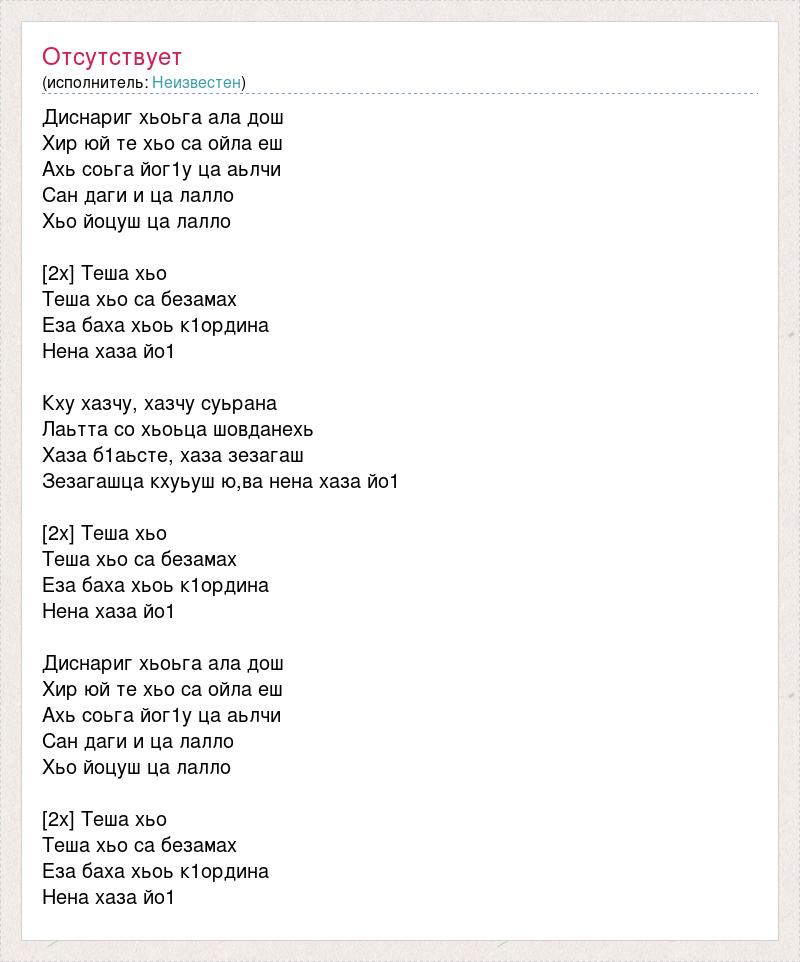 Диснариг хьоьга ала дош Хир юй те хьо са ойла еш Ахь соьга йог1у ца аьлчи Сан даги и ца лалло Хьо йоцуш ца лалло [2х] Теша хьо Теша хьо са безамах Еза баха хьоь к1ордина Нена хаза йо1 Кху хазчу, хазчу суьрана Лаьтта со хьоьца шовданехь Хаза б1аьсте, хаза зезагаш Зезагашца кхуьуш ю,ва нена хаза йо1 [2х] Теша хьо Теша хьо са безамах Еза баха хьоь к1ордина Нена хаза йо1 Диснариг хьоьга ала дош Хир юй те хьо са ойла еш Ахь соьга йог1у ца аьлчи Сан даги и ца лалло Хьо йоцуш ца лалло [2х] Теша хьо Теша хьо са безамах Еза баха хьоь к1ордина Нена хаза йо1