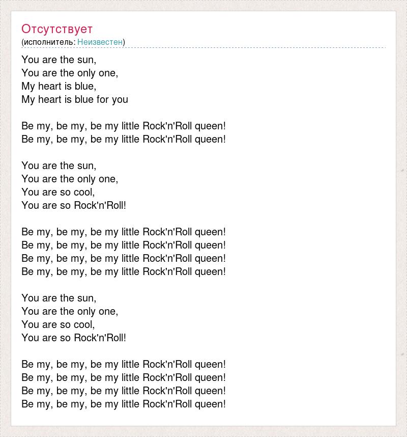 You are the sun, You are the only one, My heart is blue, My heart is blue for you Be my, be my, be my little Rock'n'Roll queen! Be my, be my, be my little Rock'n'Roll queen! You are the sun, You are the only one, You are so cool, You are so Rock'n'Roll! Be my, be my, be my little Rock'n'Roll queen! Be my, be my, be my little Rock'n'Roll queen! Be my, be my, be my little Rock'n'Roll queen! Be my, be my, be my little Rock'n'Roll queen! You are the sun, You are the only one, You are so cool, You are so Rock'n'Roll! Be my, be my, be my little Rock'n'Roll queen! Be my, be my, be my little Rock'n'Roll queen! Be my, be my, be my little Rock'n'Roll queen! Be my, be my, be my little Rock'n'Roll queen!