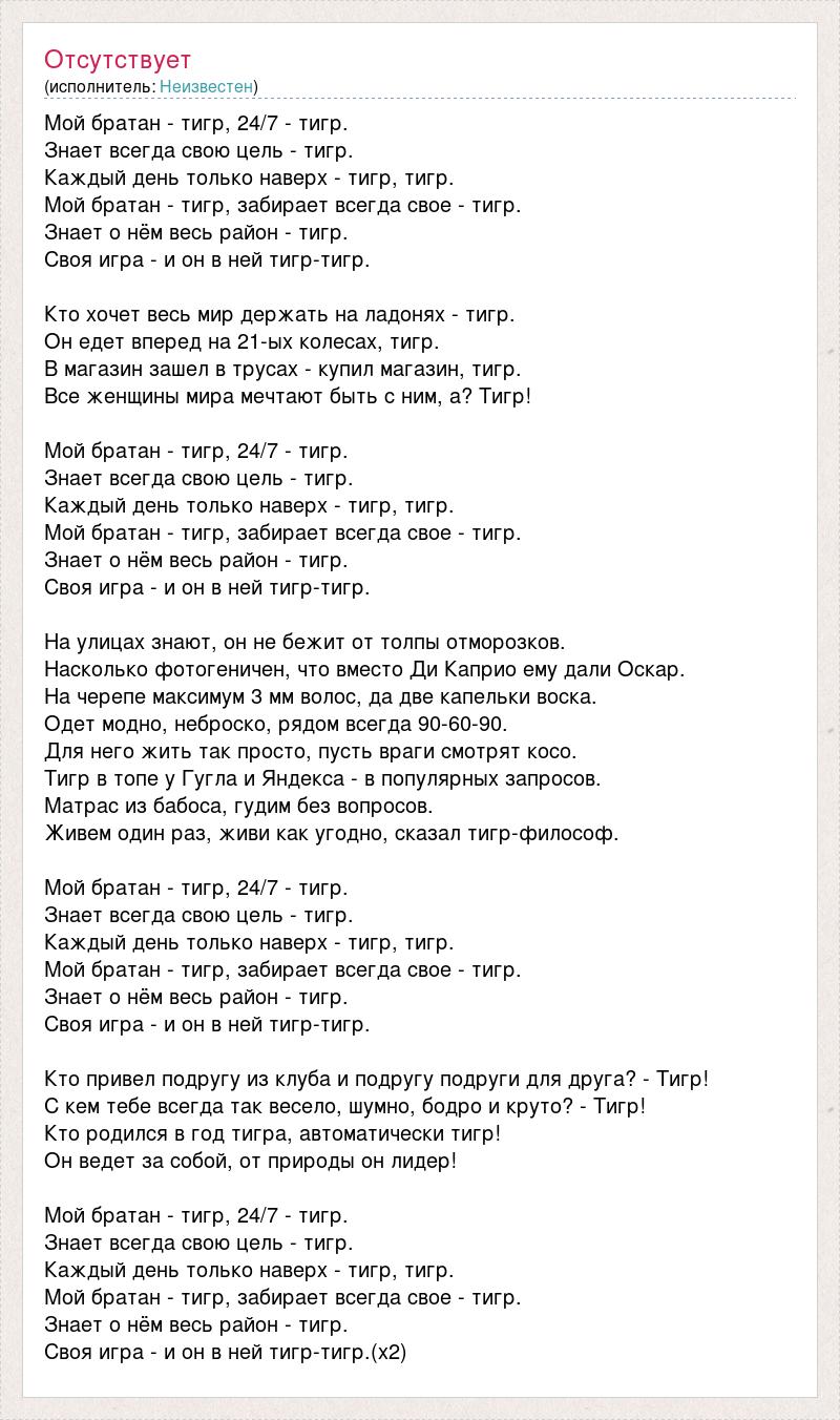 Мой братан - тигр, 24/7 - тигр. Знает всегда свою цель - тигр. Каждый день только наверх - тигр, тигр. Мой братан - тигр, забирает всегда свое - тигр. Знает о нём весь район - тигр. Своя игра - и он в ней тигр-тигр. Кто хочет весь мир держать на ладонях - тигр. Он едет вперед на 21-ых колесах, тигр. В магазин зашел в трусах - купил магазин, тигр. Все женщины мира мечтают быть с ним, а? Тигр! Мой братан - тигр, 24/7 - тигр. Знает всегда свою цель - тигр. Каждый день только наверх - тигр, тигр. Мой братан - тигр, забирает всегда свое - тигр. Знает о нём весь район - тигр. Своя игра - и он в ней тигр-тигр. На улицах знают, он не бежит от толпы отморозков. Насколько фотогеничен, что вместо Ди Каприо ему дали Оскар. На черепе максимум 3 мм волос, да две капельки воска. Одет модно, неброско, рядом всегда 90-60-90. Для него жить так просто, пусть враги смотрят косо. Тигр в топе у Гугла и Яндекса - в популярных запросов. Матрас из бабоса, гудим без вопросов. Живем один раз, живи как угодно, сказал тигр-философ. Мой братан - тигр, 24/7 - тигр. Знает всегда свою цель - тигр. Каждый день только наверх - тигр, тигр. Мой братан - тигр, забирает всегда свое - тигр. Знает о нём весь район - тигр. Своя игра - и он в ней тигр-тигр. Кто привел подругу из клуба и подругу подруги для друга? - Тигр! С кем тебе всегда так весело, шумно, бодро и круто? - Тигр! Кто родился в год тигра, автоматически тигр! Он ведет за собой, от природы он лидер! Мой братан - тигр, 24/7 - тигр. Знает всегда свою цель - тигр. Каждый день только наверх - тигр, тигр. Мой братан - тигр, забирает всегда свое - тигр. Знает о нём весь район - тигр. Своя игра - и он в ней тигр-тигр.(х2)