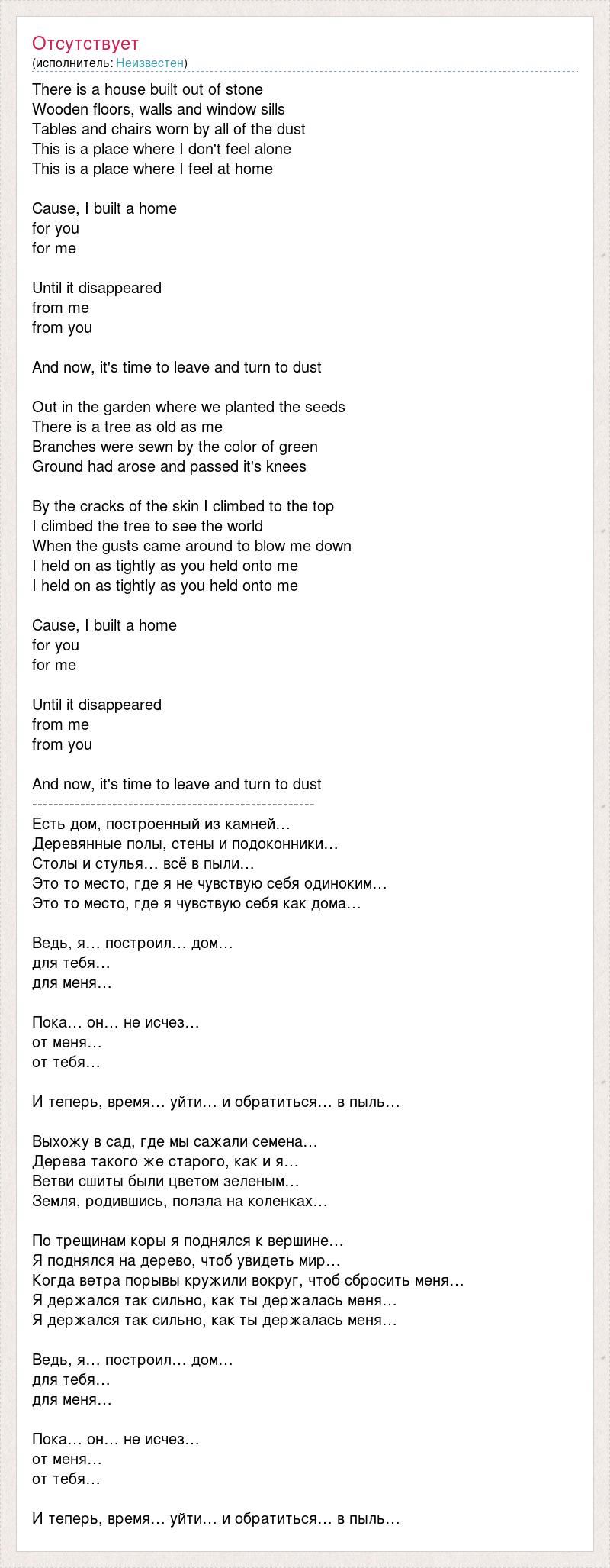 There is a house built out of stone Wooden floors, walls and window sills Tables and chairs worn by all of the dust This is a place where I don't feel alone This is a place where I feel at home Cause, I built a home for you for me Until it disappeared from me from you And now, it's time to leave and turn to dust Out in the garden where we planted the seeds There is a tree as old as me Branches were sewn by the color of green Ground had arose and passed it's knees By the cracks of the skin I climbed to the top I climbed the tree to see the world When the gusts came around to blow me down I held on as tightly as you held onto me I held on as tightly as you held onto me Cause, I built a home for you for me Until it disappeared from me from you And now, it's time to leave and turn to dust ----------------------------------------------------- Есть дом, построенный из камней… Деревянные полы, стены и подоконники… Столы и стулья… всё в пыли… Это то место, где я не чувствую себя одиноким… Это то место, где я чувствую себя как дома… Ведь, я… построил… дом… для тебя… для меня… Пока… он… не исчез… от меня… от тебя… И теперь, время… уйти… и обратиться… в пыль… Выхожу в сад, где мы сажали семена… Дерева такого же старого, как и я… Ветви сшиты были цветом зеленым… Земля, родившись, ползла на коленках… По трещинам коры я поднялся к вершине… Я поднялся на дерево, чтоб увидеть мир… Когда ветра порывы кружили вокруг, чтоб сбросить меня… Я держался так сильно, как ты держалась меня… Я держался так сильно, как ты держалась меня… Ведь, я… построил… дом… для тебя… для меня… Пока… он… не исчез… от меня… от тебя… И теперь, время… уйти… и обратиться… в пыль…