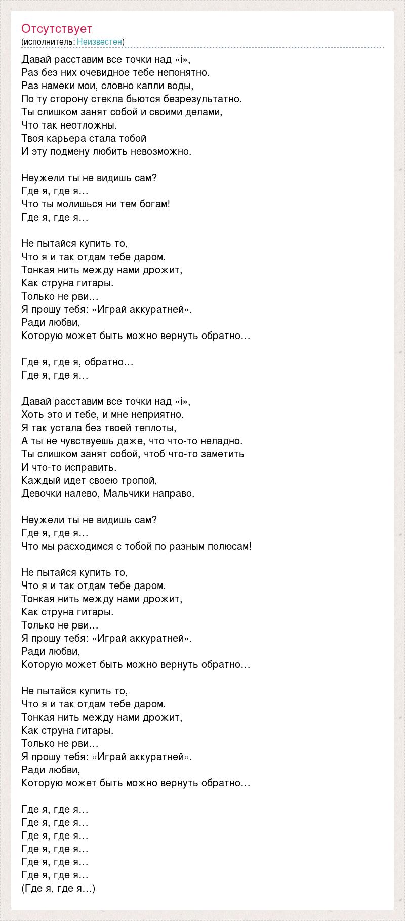 Давай расставим все точки над «i», Раз без них очевидное тебе непонятно. Раз намеки мои, словно капли воды, По ту сторону стекла бьются безрезультатно. Ты слишком занят собой и своими делами, Что так неотложны. Твоя карьера стала тобой И эту подмену любить невозможно. Неужели ты не видишь сам? Где я, где я… Что ты молишься ни тем богам! Где я, где я… Не пытайся купить то, Что я и так отдам тебе даром. Тонкая нить между нами дрожит, Как струна гитары. Только не рви… Я прошу тебя: «Играй аккуратней». Ради любви, Которую может быть можно вернуть обратно… Где я, где я, обратно… Где я, где я… Давай расставим все точки над «i», Хоть это и тебе, и мне неприятно. Я так устала без твоей теплоты, А ты не чувствуешь даже, что что-то неладно. Ты слишком занят собой, чтоб что-то заметить И что-то исправить. Каждый идет своею тропой, Девочки налево, Мальчики направо. Неужели ты не видишь сам? Где я, где я… Что мы расходимся с тобой по разным полюсам! Не пытайся купить то, Что я и так отдам тебе даром. Тонкая нить между нами дрожит, Как струна гитары. Только не рви… Я прошу тебя: «Играй аккуратней». Ради любви, Которую может быть можно вернуть обратно… Не пытайся купить то, Что я и так отдам тебе даром. Тонкая нить между нами дрожит, Как струна гитары. Только не рви… Я прошу тебя: «Играй аккуратней». Ради любви, Которую может быть можно вернуть обратно… Где я, где я… Где я, где я… Где я, где я… Где я, где я… Где я, где я… Где я, где я… (Где я, где я…)
