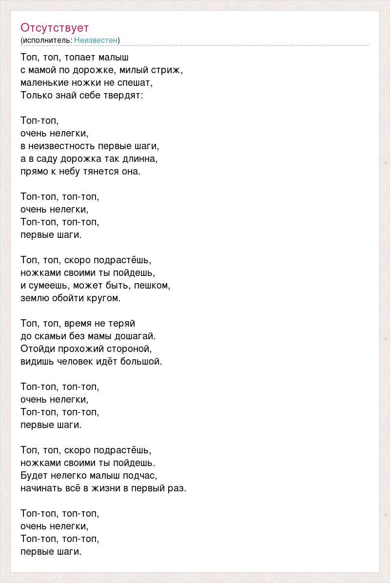 Топ, топ, топает малыш с мамой по дорожке, милый стриж, маленькие ножки не спешат, Только знай себе твердят: Топ-топ, очень нелегки, в неизвестность первые шаги, а в саду дорожка так длинна, прямо к небу тянется она. Топ-топ, топ-топ, очень нелегки, Топ-топ, топ-топ, первые шаги. Топ, топ, скоро подрастёшь, ножками своими ты пойдешь, и сумеешь, может быть, пешком, землю обойти кругом. Топ, топ, время не теряй до скамьи без мамы дошагай. Отойди прохожий стороной, видишь человек идёт большой. Топ-топ, топ-топ, очень нелегки, Топ-топ, топ-топ, первые шаги. Топ, топ, скоро подрастёшь, ножками своими ты пойдешь. Будет нелегко малыш подчас, начинать всё в жизни в первый раз. Топ-топ, топ-топ, очень нелегки, Топ-топ, топ-топ, первые шаги.