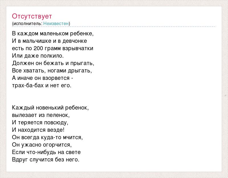 В каждом маленьком ребенке, И в мальчишке и в девчонке есть по 200 грамм взрывчатки Или даже полкило. Должен он бежать и прыгать, Все хватать, ногами дрыгать, А иначе он взорвется - трах-ба-бах и нет его. Каждый новенький ребенок, вылезает из пеленок, И теряется повсюду, И находится везде! Он всегда куда-то мчится, Он ужасно огорчится, Если что-нибудь на свете Вдруг случится без него.