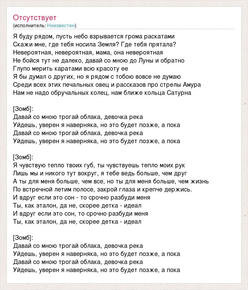 Я буду рядом, пусть небо взрывается грома раскатами Скажи мне, где тебя носила Земля? Где тебя прятала? Невероятная, невероятная, мама, она невероятная Не бойся тут не далеко, давай со мною до Луны и обратно Глупо мерить каратами всю красоту ее Я бы думал о других, но я рядом с тобою вовсе не думаю Среди всех этих печальных овец и рассказов про стрелы Амура Нам не надо обручальных колец, нам ближе кольца Сатурна [Зомб]: Давай со мною трогай облака, девочка река Уйдешь, уверен я наверняка, но это будет позже, а пока Давай со мною трогай облака, девочка река Уйдешь, уверен я наверняка, но это будет позже, а пока [Зомб]: Я чувствую тепло твоих губ, ты чувствуешь тепло моих рук Лишь мы и никого тут вокруг, я тебе ведь больше, чем друг А ты для меня больше, чем все, но ты для меня больше, чем жизнь По встречной летим полосе, закрой глаза и крепче держись. И вдруг если это сон - то срочно разбуди меня Ты, как эталон, да не, скорее детка - идеал И вдруг если это сон, то срочно разбуди меня Ты, как эталон, да не, скорее детка - идеал [Зомб]: Давай со мною трогай облака, девочка река Уйдешь, уверен я наверняка, но это будет позже, а пока Давай со мною трогай облака, девочка река Уйдешь, уверен я наверняка, но это будет позже, а пока