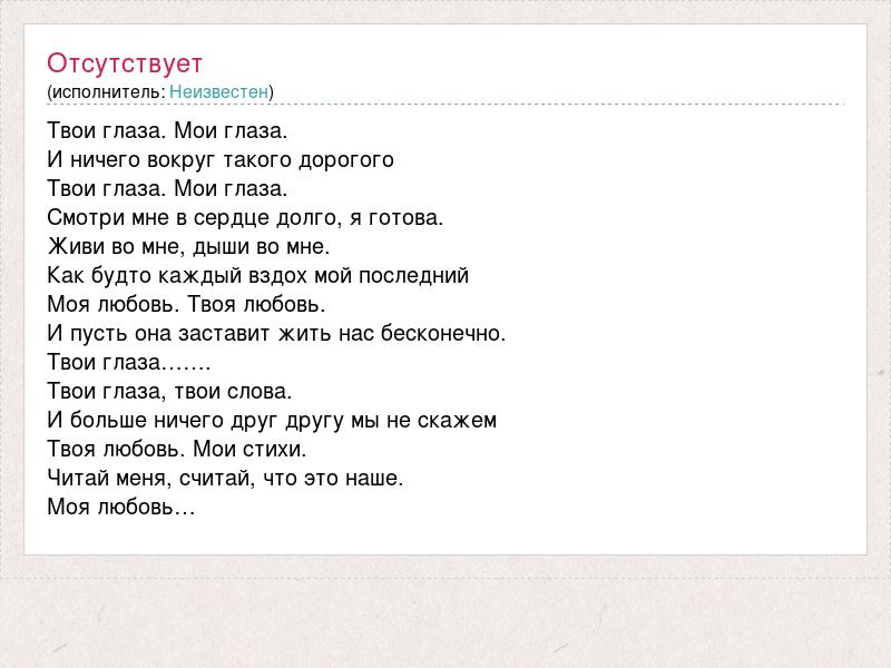 Твои глаза. Мои глаза. И ничего вокруг такого дорогого Твои глаза. Мои глаза. Смотри мне в сердце долго, я готова. Живи во мне, дыши во мне. Как будто каждый вздох мой последний Моя любовь. Твоя любовь. И пусть она заставит жить нас бесконечно. Твои глаза……. Твои глаза, твои слова. И больше ничего друг другу мы не скажем Твоя любовь. Мои стихи. Читай меня, считай, что это наше. Моя любовь…