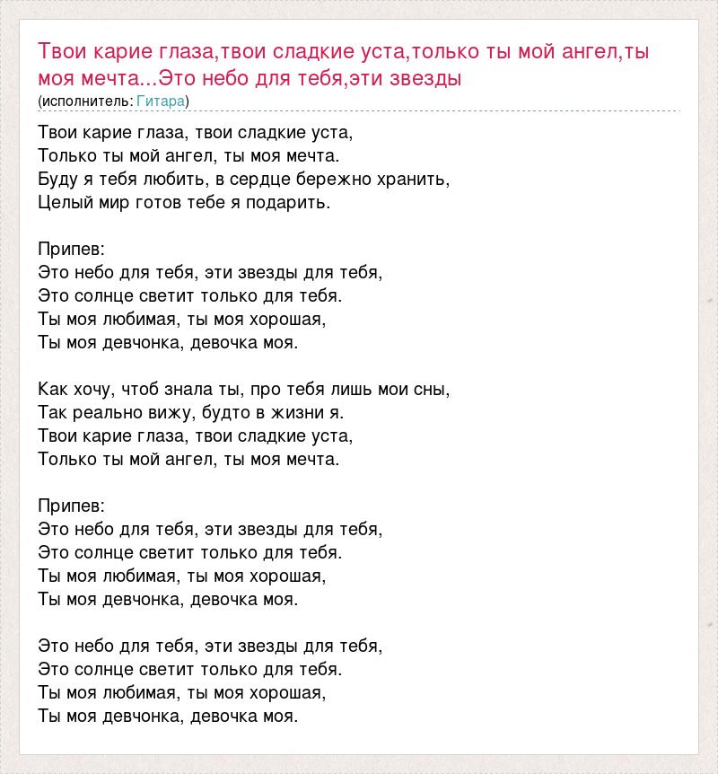 Твои карие глаза, твои сладкие уста, Только ты мой ангел, ты моя мечта. Буду я тебя любить, в сердце бережно хранить, Целый мир готов тебе я подарить. Припев: Это небо для тебя, эти звезды для тебя, Это солнце светит только для тебя. Ты моя любимая, ты моя хорошая, Ты моя девчонка, девочка моя. Как хочу, чтоб знала ты, про тебя лишь мои сны, Так реально вижу, будто в жизни я. Твои карие глаза, твои сладкие уста, Только ты мой ангел, ты моя мечта. Припев: Это небо для тебя, эти звезды для тебя, Это солнце светит только для тебя. Ты моя любимая, ты моя хорошая, Ты моя девчонка, девочка моя. Это небо для тебя, эти звезды для тебя, Это солнце светит только для тебя. Ты моя любимая, ты моя хорошая, Ты моя девчонка, девочка моя.