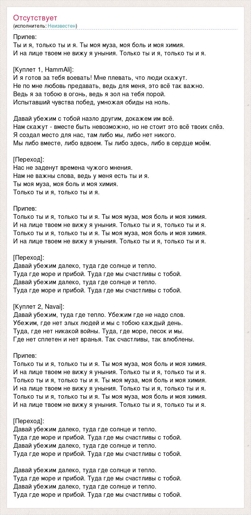 Припев: Ты и я, только ты и я. Ты моя муза, моя боль и моя химия. И на лице твоем не вижу я уныния. Только ты и я, только ты и я. [Куплет 1, HammAli]: И я готов за тебя воевать! Мне плевать, что люди скажут. Не по мне любовь предавать, ведь для меня, это всё так важно. Ведь я за тобою в огонь, ведь я зол на тебя порой. Испытавший чувства побед, умножая обиды на ноль. Давай убежим с тобой назло другим, докажем им всё. Нам скажут - вместе быть невозможно, но не стоит это всё твоих слёз. Я создал место для нас, там либо мы, либо нет никого. Мы либо вместе, либо вдвоем. Ты либо здесь, либо в сердце моём. [Переход]: Нас не заденут времена чужого мнения. Нам не важны слова, ведь у меня есть ты и я. Ты моя муза, моя боль и моя химия. Только ты и я, только ты и я. Припев: Только ты и я, только ты и я. Ты моя муза, моя боль и моя химия. И на лице твоем не вижу я уныния. Только ты и я, только ты и я. Только ты и я, только ты и я. Ты моя муза, моя боль и моя химия. И на лице твоем не вижу я уныния. Только ты и я, только ты и я. [Переход]: Давай убежим далеко, туда где солнце и тепло. Туда где море и прибой. Туда где мы счастливы с тобой. Давай убежим далеко, туда где солнце и тепло. Туда где море и прибой. Туда где мы счастливы с тобой. [Куплет 2, Navai]: Давай убежим, туда где тепло. Убежим где не надо слов. Убежим, где нет злых людей и мы с тобою каждый день. Туда, где нет никакой войны. Туда, где море, песок и мы. Где нет сплетен и нет вранья. Так счастливы, так влюблены. Припев: Только ты и я, только ты и я. Ты моя муза, моя боль и моя химия. И на лице твоем не вижу я уныния. Только ты и я, только ты и я. Только ты и я, только ты и я. Ты моя муза, моя боль и моя химия. И на лице твоем не вижу я уныния. Только ты и я, только ты и я. Только ты и я, только ты и я. Ты моя муза, моя боль и моя химия. И на лице твоем не вижу я уныния. Только ты и я, только ты и я. [Переход]: Давай убежим далеко, туда где солнце и тепло. Туда где море и прибой. Туда где мы счастливы с тобой. Давай убежим далеко, туда где солнце и тепло. Туда где море и прибой. Туда где мы счастливы с тобой. Давай убежим далеко, туда где солнце и тепло. Туда где море и прибой. Туда где мы счастливы с тобой. Давай убежим далеко, туда где солнце и тепло. Туда где море и прибой. Туда где мы счастливы с тобой.