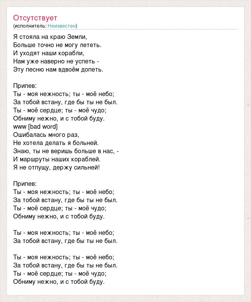 Я стояла на краю Земли, Больше точно не могу лететь. И уходят наши корабли, Нам уже наверно не успеть - Эту песню нам вдвоём допеть. Припев: Ты - моя нежность; ты - моё небо; За тобой встану, где бы ты не был. Ты - моё сердце; ты - моё чудо; Обниму нежно, и с тобой буду. www [bad word] Ошибалась много раз, Не хотела делать я больней. Знаю, ты не веришь больше в нас, - И маршруты наших кораблей. Я не отпущу, держу сильней! Припев: Ты - моя нежность; ты - моё небо; За тобой встану, где бы ты не был. Ты - моё сердце; ты - моё чудо; Обниму нежно, и с тобой буду. Ты - моя нежность; ты - моё небо; За тобой встану, где бы ты не был. Ты - моя нежность; ты - моё небо; За тобой встану, где бы ты не был. Ты - моё сердце; ты - моё чудо; Обниму нежно, и с тобой буду.