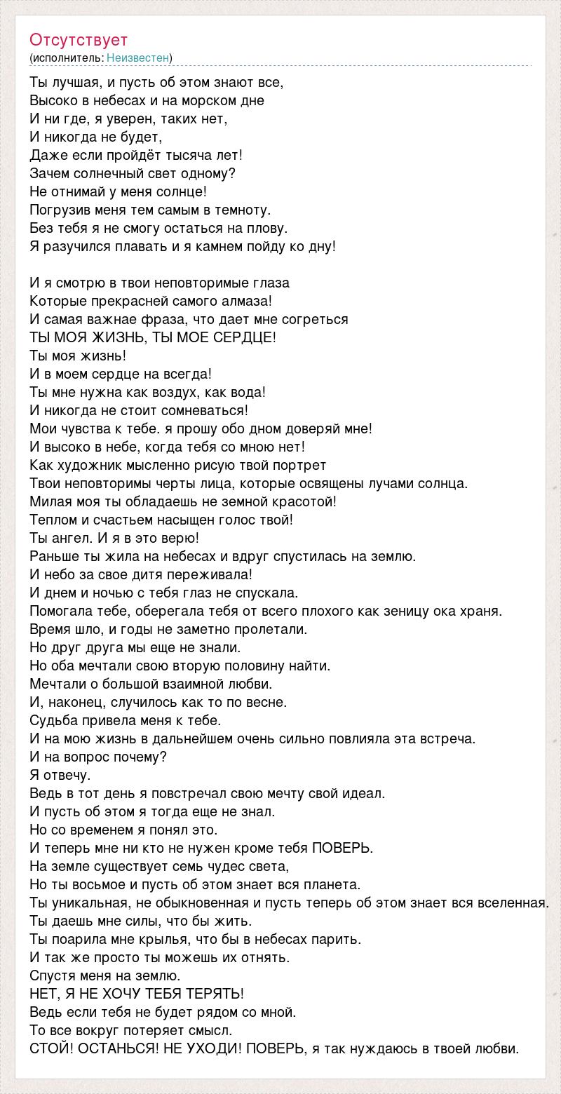 Ты лучшая, и пусть об этом знают все, Высоко в небесах и на морском дне И ни где, я уверен, таких нет, И никогда не будет, Даже если пройдёт тысяча лет! Зачем солнечный свет одному? Не отнимай у меня солнце! Погрузив меня тем самым в темноту. Без тебя я не смогу остаться на плову. Я разучился плавать и я камнем пойду ко дну! И я смотрю в твои неповторимые глаза Которые прекрасней самого алмаза! И самая важнае фраза, что дает мне согреться ТЫ МОЯ ЖИЗНЬ, ТЫ МОЕ СЕРДЦЕ! Ты моя жизнь! И в моем сердце на всегда! Ты мне нужна как воздух, как вода! И никогда не стоит сомневаться! Мои чувства к тебе. я прошу обо дном доверяй мне! И высоко в небе, когда тебя со мною нет! Как художник мысленно рисую твой портрет Твои неповторимы черты лица, которые освящены лучами солнца. Милая моя ты обладаешь не земной красотой! Теплом и счастьем насыщен голос твой! Ты ангел. И я в это верю! Раньше ты жила на небесах и вдруг спустилась на землю. И небо за свое дитя переживала! И днем и ночью с тебя глаз не спускала. Помогала тебе, оберегала тебя от всего плохого как зеницу ока храня. Время шло, и годы не заметно пролетали. Но друг друга мы еще не знали. Но оба мечтали свою вторую половину найти. Мечтали о большой взаимной любви. И, наконец, случилось как то по весне. Судьба привела меня к тебе. И на мою жизнь в дальнейшем очень сильно повлияла эта встреча. И на вопрос почему? Я отвечу. Ведь в тот день я повстречал свою мечту свой идеал. И пусть об этом я тогда еще не знал. Но со временем я понял это. И теперь мне ни кто не нужен кроме тебя ПОВЕРЬ. На земле существует семь чудес света, Но ты восьмое и пусть об этом знает вся планета. Ты уникальная, не обыкновенная и пусть теперь об этом знает вся вселенная. Ты даешь мне силы, что бы жить. Ты поарила мне крылья, что бы в небесах парить. И так же просто ты можешь их отнять. Спустя меня на землю. НЕТ, Я НЕ ХОЧУ ТЕБЯ ТЕРЯТЬ! Ведь если тебя не будет рядом со мной. То все вокруг потеряет смысл. СТОЙ! ОСТАНЬСЯ! НЕ УХОДИ! ПОВЕРЬ, я так нуждаюсь в твоей любви.