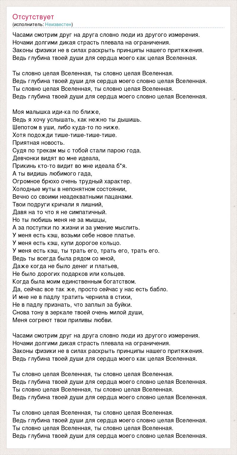 Часами смотрим друг на друга словно люди из другого измерения. Ночами долгими дикая страсть плевала на ограничения. Законы физики не в силах раскрыть принципы нашего притяжения. Ведь глубина твоей души для сердца моего как целая Вселенная. Ты словно целая Вселенная, ты словно целая Вселенная. Ведь глубина твоей души для сердца моего словно целая Вселенная. Ты словно целая Вселенная, ты словно целая Вселенная. Ведь глубина твоей души для сердца моего словно целая Вселенная. Моя малышка иди-ка по ближе, Ведь я хочу услышать, как нежно ты дышишь. Шепотом в уши, либо куда-то по ниже. Хотя подожди тише-тише-тише-тише. Приятная новость. Судя по трекам мы с тобой стали парою года. Девчонки видят во мне идеала, Прикинь кто-то видит во мне идеала б*я. А ты видишь любимого гада, Огромное брюхо очень трудный характер. Холодные муты в непонятном состоянии, Вечно со своими неадекватными пацанами. Твои подруги кричали я лишний, Давя на то что я не симпатичный. Но ты любишь меня не за мышцы, А за поступки по жизни и за умение мыслить. У меня есть кэш, возьми себе новое платье. У меня есть кэш, купи дорогое кольцо. У меня есть кэш, ты трать его, трать его, трать его. Ведь ты всегда была рядом со мной, Даже когда не было денег и платьев, Не было дорогих подарков или кольцев. Когда была моим единственным богатством. Да, сейчас все так же, просто сейчас у нас есть бабло. И мне не в падлу тратить чернила в стихи, Не в падлу признать, что заплыл за буйки. Снова тону в зеркале твоей очень милой души, Меня согреют твои приливы любви. Часами смотрим друг на друга словно люди из другого измерения. Ночами долгими дикая страсть плевала на ограничения. Законы физики не в силах раскрыть принципы нашего притяжения. Ведь глубина твоей души для сердца моего как целая Вселенная. Ты словно целая Вселенная, ты словно целая Вселенная. Ведь глубина твоей души для сердца моего словно целая Вселенная. Ты словно целая Вселенная, ты словно целая Вселенная. Ведь глубина твоей души для сердца моего словно целая Вселенная. Ты словно целая Вселенная, ты словно целая Вселенная. Ведь глубина твоей души для сердца моего словно целая Вселенная. Ты словно целая Вселенная, ты словно целая Вселенная. Ведь глубина твоей души для сердца моего словно целая Вселенная.