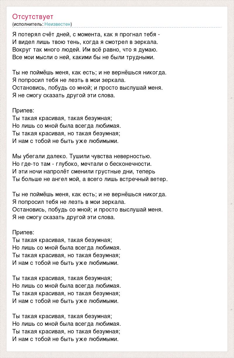 Я потерял счёт дней, с момента, как я прогнал тебя - И видел лишь твою тень, когда я смотрел в зеркала. Вокруг так много людей. Им всё равно, что я думаю. Все мои мысли о ней, какими бы не были трудными. Ты не поймёшь меня, как есть; и не вернёшься никогда. Я попросил тебя не лезть в мои зеркала. Остановись, побудь со мной; и просто выслушай меня. Я не смогу сказать другой эти слова. Припев: Ты такая красивая, такая безумная; Но лишь со мной была всегда любимая. Ты такая красивая, но такая безумная; И нам с тобой не быть уже любимыми. Мы убегали далеко. Тушили чувства неверностью. Но где-то там - глубоко, мечтали о бесконечности. И эти ночи напролёт сменили грустные дни, теперь Ты больше не ангел мой, а всего лишь встречный ветер. Ты не поймёшь меня, как есть; и не вернёшься никогда. Я попросил тебя не лезть в мои зеркала. Остановись, побудь со мной; и просто выслушай меня. Я не смогу сказать другой эти слова. Припев: Ты такая красивая, такая безумная; Но лишь со мной была всегда любимая. Ты такая красивая, но такая безумная; И нам с тобой не быть уже любимыми. Ты такая красивая, такая безумная; Но лишь со мной была всегда любимая. Ты такая красивая, но такая безумная; И нам с тобой не быть уже любимыми. Ты такая красивая, такая безумная; Но лишь со мной была всегда любимая. Ты такая красивая, но такая безумная; И нам с тобой не быть уже любимыми.