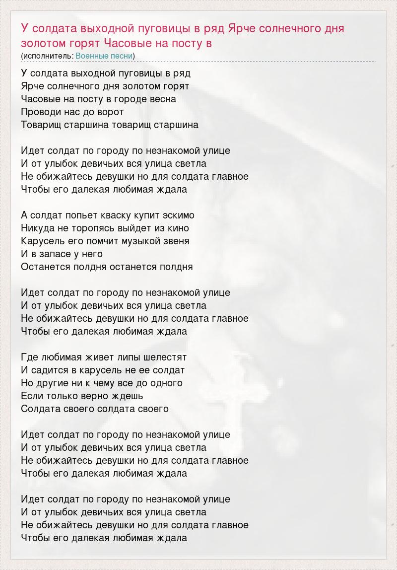 У солдата выходной пуговицы в ряд Ярче солнечного дня золотом горят Часовые на посту в городе весна Проводи нас до ворот Товарищ старшина товарищ старшина Идет солдат по городу по незнакомой улице И от улыбок девичьих вся улица светла Не обижайтесь девушки но для солдата главное Чтобы его далекая любимая ждала А солдат попьет кваску купит эскимо Никуда не торопясь выйдет из кино Карусель его помчит музыкой звеня И в запасе у него Останется полдня останется полдня Идет солдат по городу по незнакомой улице И от улыбок девичьих вся улица светла Не обижайтесь девушки но для солдата главное Чтобы его далекая любимая ждала Где любимая живет липы шелестят И садится в карусель не ее солдат Но другие ни к чему все до одного Если только верно ждешь Солдата своего солдата своего Идет солдат по городу по незнакомой улице И от улыбок девичьих вся улица светла Не обижайтесь девушки но для солдата главное Чтобы его далекая любимая ждала Идет солдат по городу по незнакомой улице И от улыбок девичьих вся улица светла Не обижайтесь девушки но для солдата главное Чтобы его далекая любимая ждала