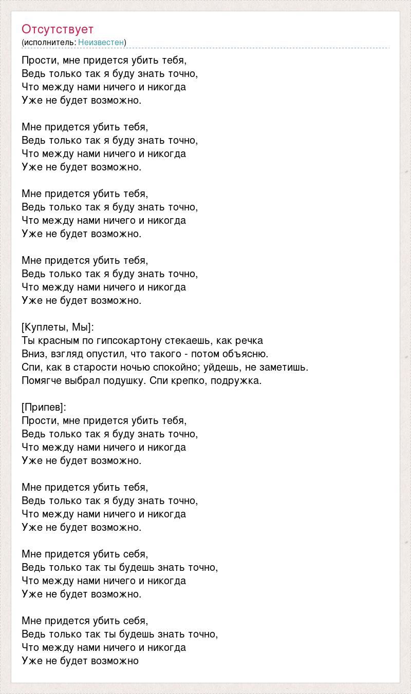 Прости, мне придется убить тебя, Ведь только так я буду знать точно, Что между нами ничего и никогда Уже не будет возможно. Мне придется убить тебя, Ведь только так я буду знать точно, Что между нами ничего и никогда Уже не будет возможно. Мне придется убить тебя, Ведь только так я буду знать точно, Что между нами ничего и никогда Уже не будет возможно. Мне придется убить тебя, Ведь только так я буду знать точно, Что между нами ничего и никогда Уже не будет возможно. [Куплеты, Мы]: Ты красным по гипсокартону стекаешь, как речка Вниз, взгляд опустил, что такого - потом объясню. Спи, как в старости ночью спокойно; уйдешь, не заметишь. Помягче выбрал подушку. Спи крепко, подружка. [Припев]: Прости, мне придется убить тебя, Ведь только так я буду знать точно, Что между нами ничего и никогда Уже не будет возможно. Мне придется убить тебя, Ведь только так я буду знать точно, Что между нами ничего и никогда Уже не будет возможно. Мне придется убить cебя, Ведь только так ты будешь знать точно, Что между нами ничего и никогда Уже не будет возможно. Мне придется убить cебя, Ведь только так ты будешь знать точно, Что между нами ничего и никогда Уже не будет возможно