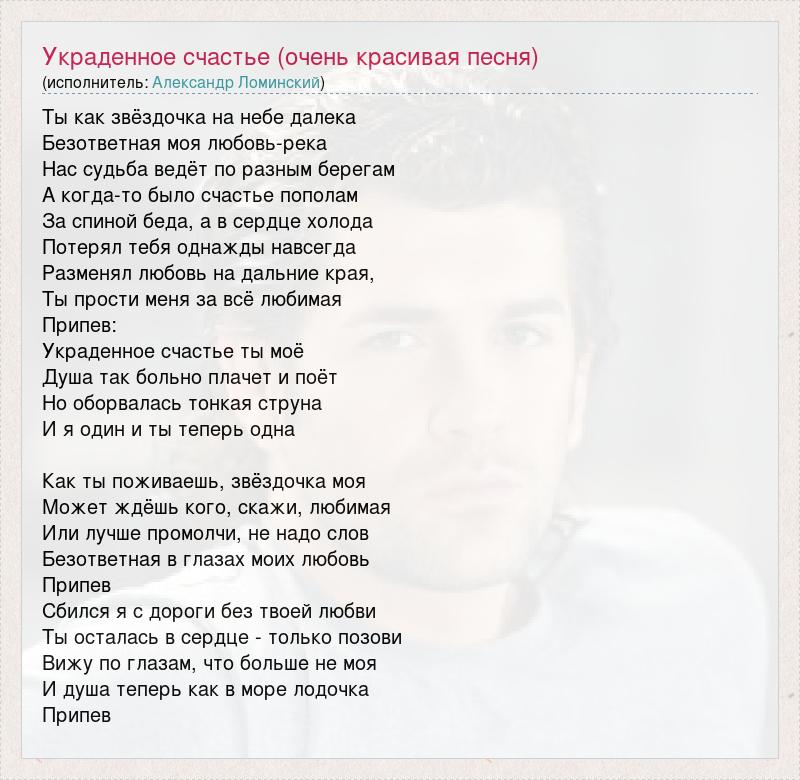 Ты как звёздочка на небе далека Безответная моя любовь-река Нас судьба ведёт по разным берегам А когда-то было счастье пополам За спиной беда, а в сердце холода Потерял тебя однажды навсегда Разменял любовь на дальние края, Ты прости меня за всё любимая Припев: Украденное счастье ты моё Душа так больно плачет и поёт Но оборвалась тонкая струна И я один и ты теперь одна Как ты поживаешь, звёздочка моя Может ждёшь кого, скажи, любимая Или лучше промолчи, не надо слов Безответная в глазах моих любовь Припев Сбился я с дороги без твоей любви Ты осталась в сердце - только позови Вижу по глазам, что больше не моя И душа теперь как в море лодочка Припев