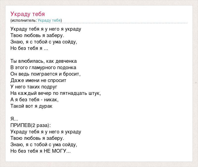 Украду тебя я у него я украду Твою любовь я заберу. Знаю, я с тобой с ума сойду, Но без тебя я ... Ты влюбилась, как девченка В этого гламурного подонка Он ведь поиграется и бросит, Даже имени не спросит У него таких подруг На каждый вечер по пятнадцать штук, А я без тебя - никак, Такой вот я дурак Я... ПРИПЕВ(2 раза): Украду тебя я у него я украду Твою любовь я заберу. Знаю, я с тобой с ума сойду, Но без тебя я НЕ МОГУ...