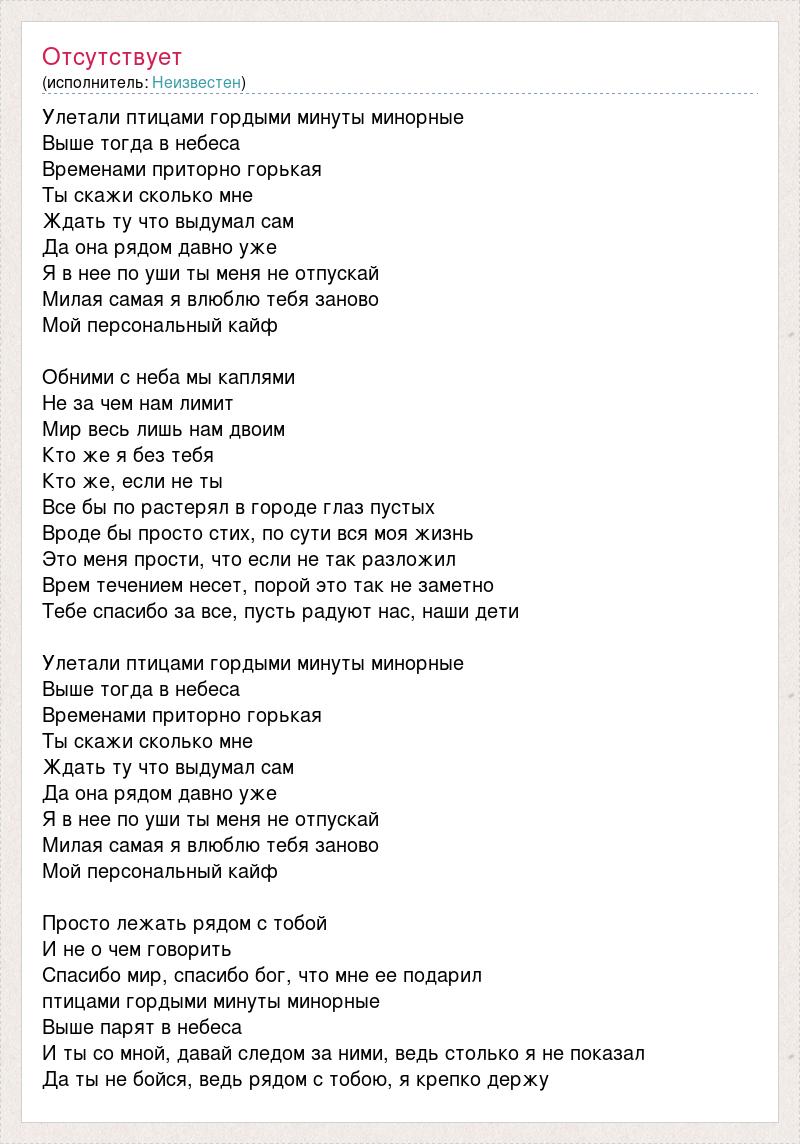 Улетали птицами гордыми минуты минорные Выше тогда в небеса Временами приторно горькая Ты скажи сколько мне Ждать ту что выдумал сам Да она рядом давно уже Я в нее по уши ты меня не отпускай Милая самая я влюблю тебя заново Мой персональный кайф Обними с неба мы каплями Не за чем нам лимит Мир весь лишь нам двоим Кто же я без тебя Кто же, если не ты Все бы по растерял в городе глаз пустых Вроде бы просто стих, по сути вся моя жизнь Это меня прости, что если не так разложил Врем течением несет, порой это так не заметно Тебе спасибо за все, пусть радуют нас, наши дети Улетали птицами гордыми минуты минорные Выше тогда в небеса Временами приторно горькая Ты скажи сколько мне Ждать ту что выдумал сам Да она рядом давно уже Я в нее по уши ты меня не отпускай Милая самая я влюблю тебя заново Мой персональный кайф Просто лежать рядом с тобой И не о чем говорить Спасибо мир, спасибо бог, что мне ее подарил птицами гордыми минуты минорные Выше парят в небеса И ты со мной, давай следом за ними, ведь столько я не показал Да ты не бойся, ведь рядом с тобою, я крепко держу